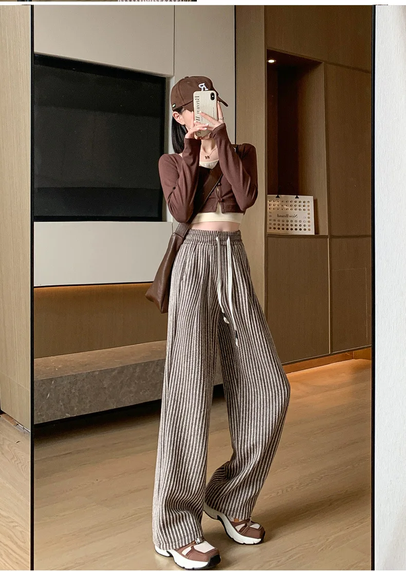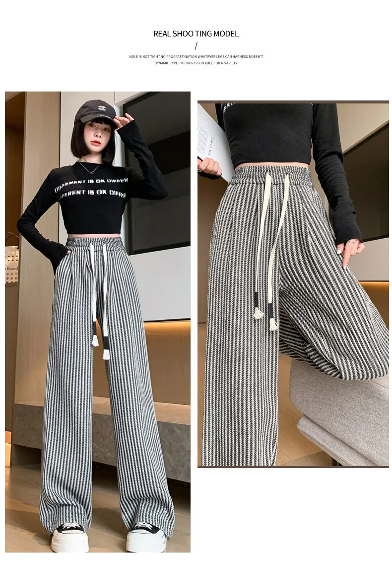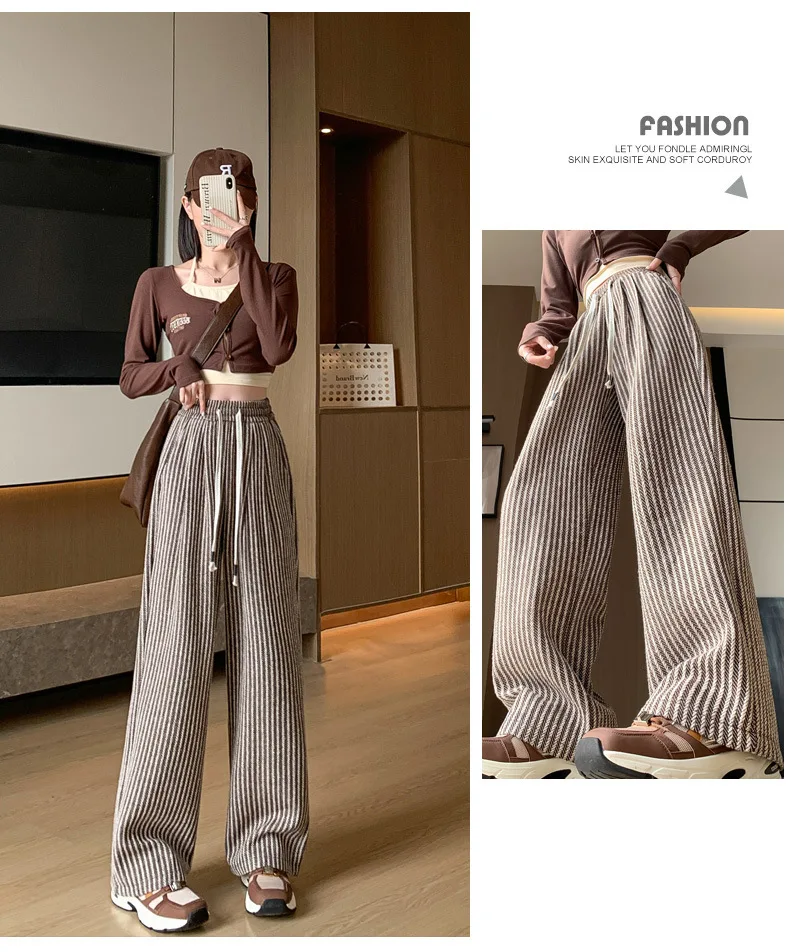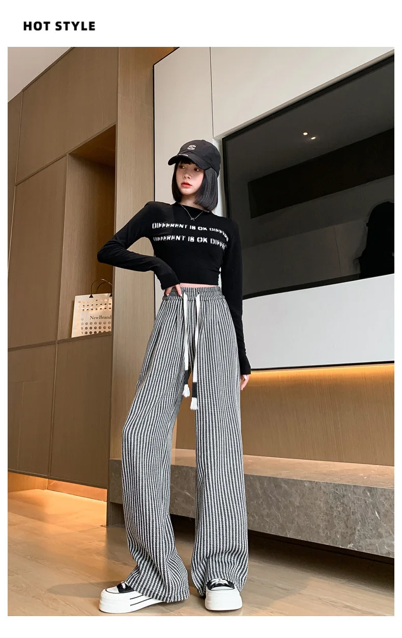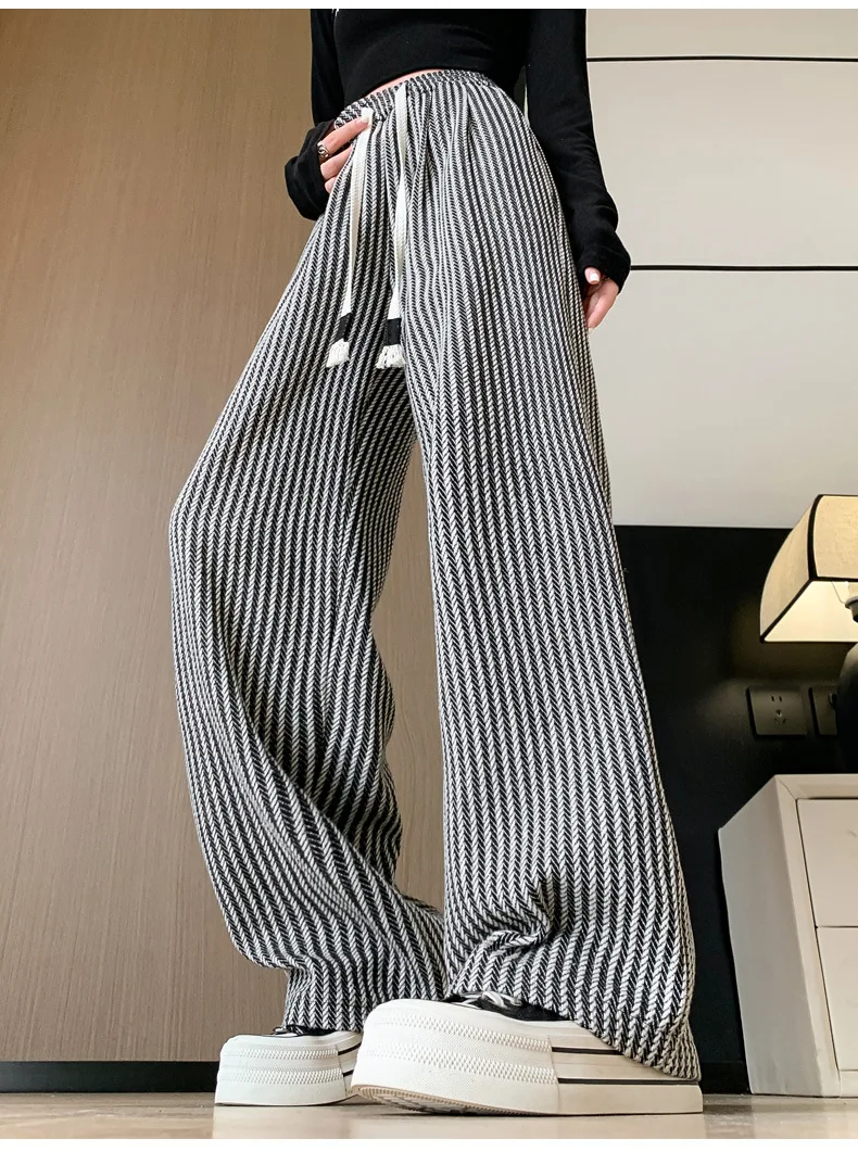 S-XL Striped Straight Casual High Waist Pants Wide Leg Drawstring For Women NEW