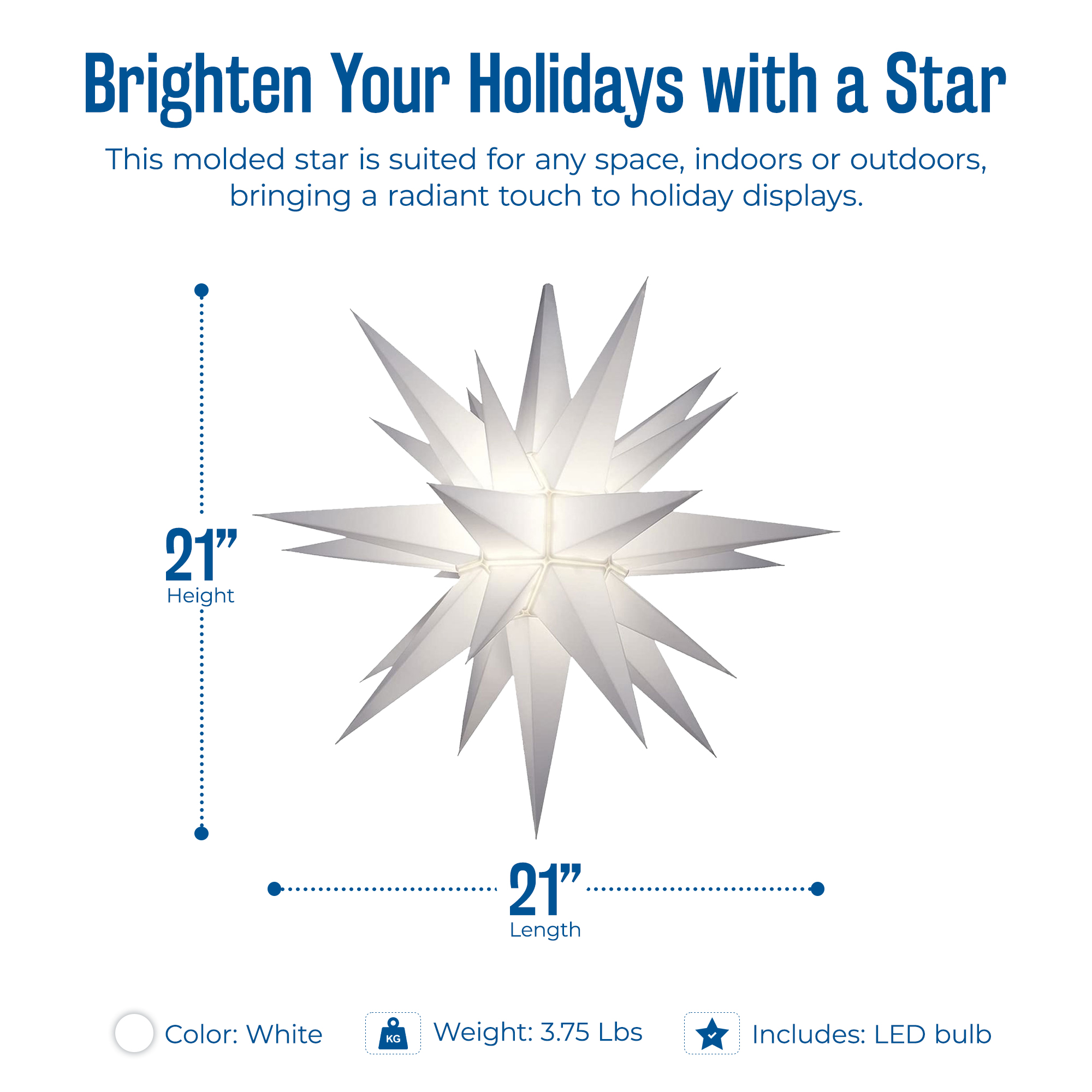 This 21-inch star of Bethlehem is a beautiful and meaningful decoration with history dating back to the 1800s, often displayed to symbolize a family's preparation for the Advent season. This decorative lighted star will create that warm welcoming feeling to your family and friends through the holiday season. Whether used indoors or outdoors, this molded star can fit in almost any space and will brighten any holiday display. This star light is easy to assemble with the twist-and-lock design. For convenience, this star decoration includes an LED bulb, and simply plugs in for ease-of-use.