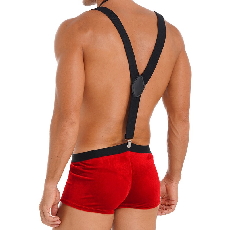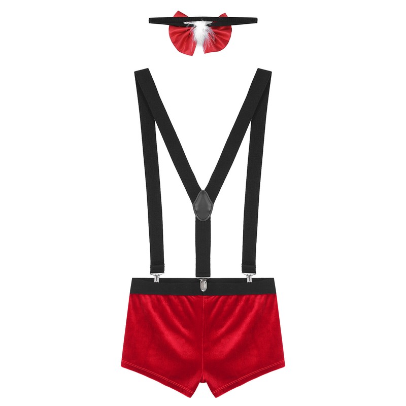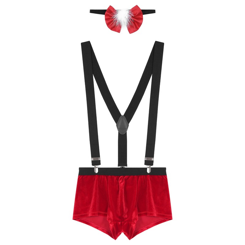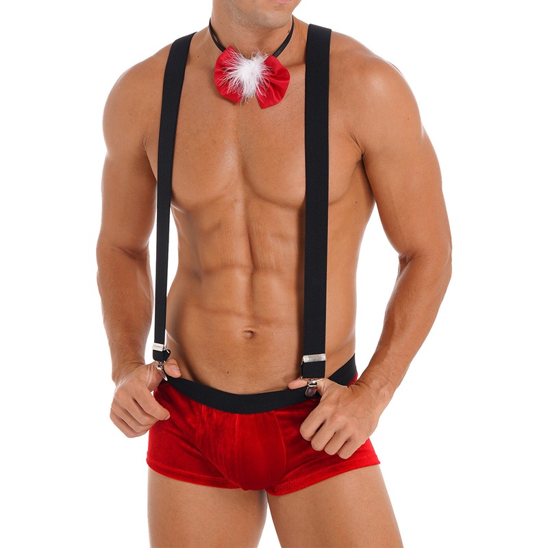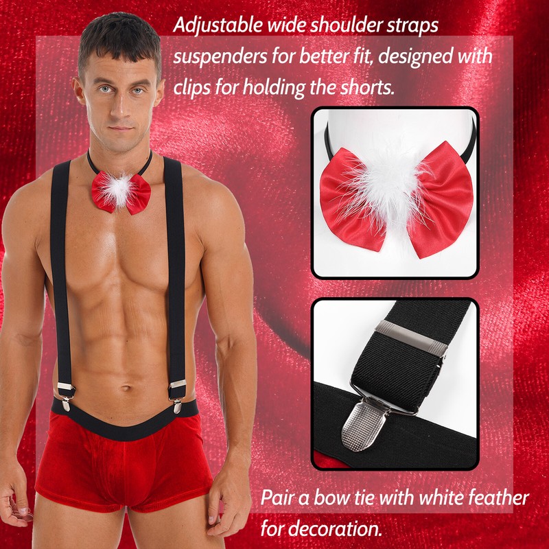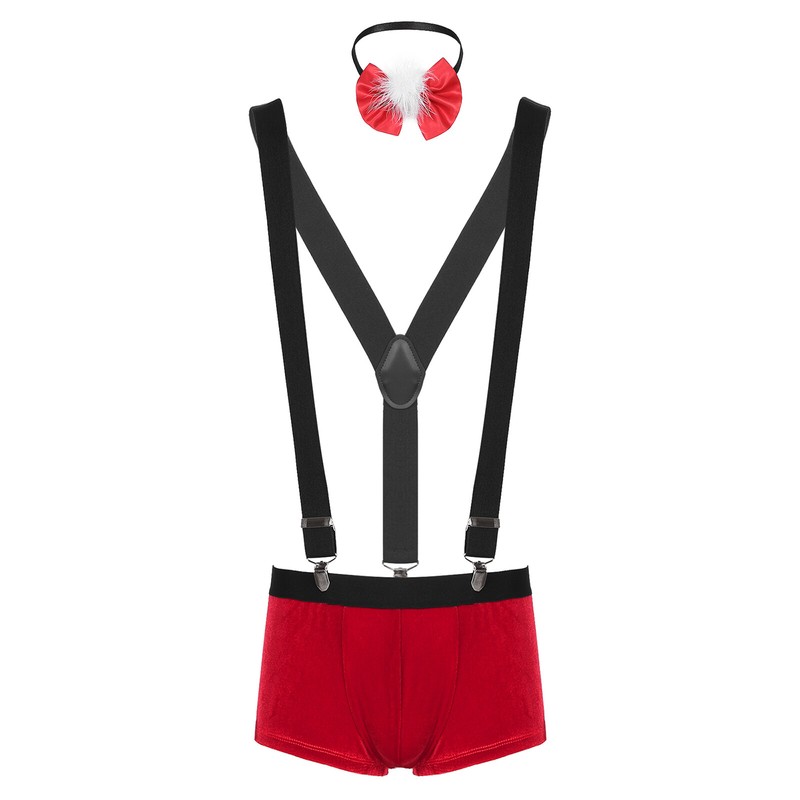 Mens Christmas Costume Nightwear Low Rise Bulge Pouch Velvet Boxer Shorts with Suspenders Bow Tie.