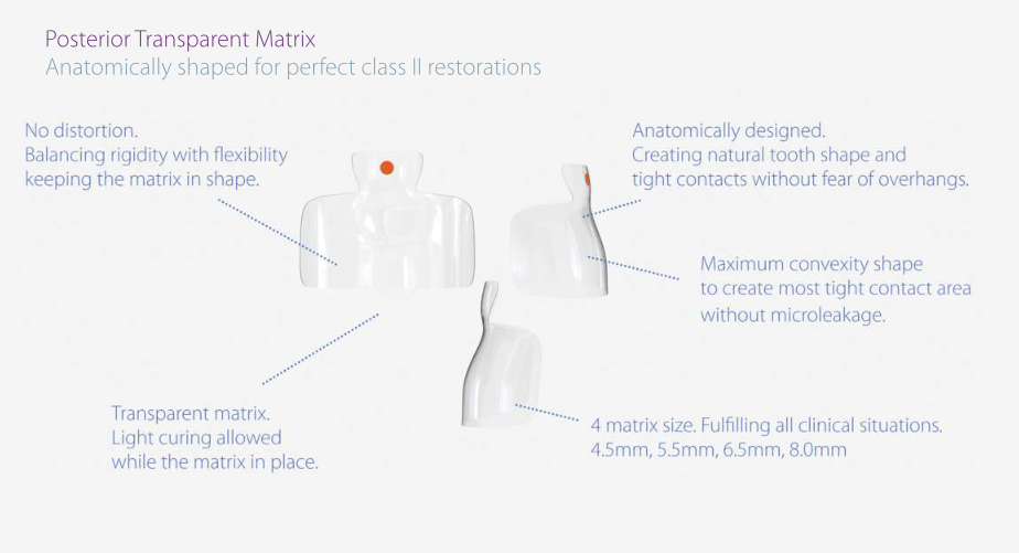 This Transparent Matrix System is designed to create consistent and predictable contact point contour forboth anterior and posterior restoration. The innovative transparent matrix features a pre-contoured andanatomically shapes for creating perfect marginal ridge without leaving overhanging margins.