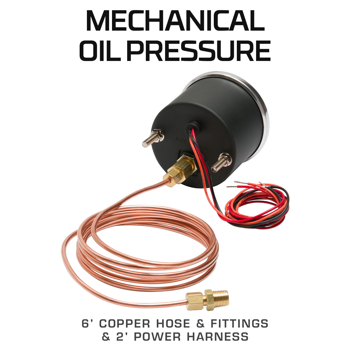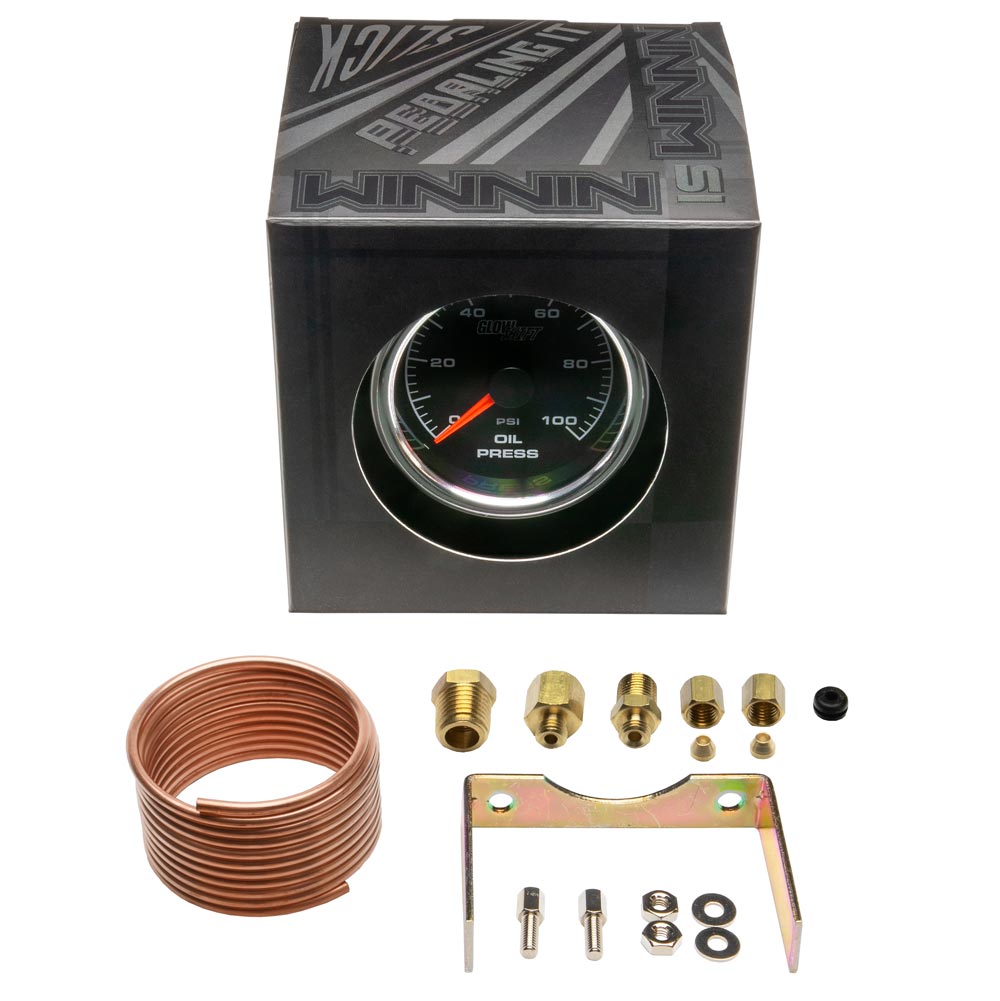 GlowShift 2-5/8 (65mm) Black & White Racing Series Mechanical Oil Pressure Gauges for cars and trucks monitor your racing applications oil PSI levels in real time with pinpoint precision. Take readings from 0 to 100 PSI to protect bearings, the crankshaft and other critical engine parts. The mechanical oil pressure gauge kit comes with 6 of 1/8 Copper Hose, 1/8 NPT Compression Ferrule Fittings, a 1/4 NPT Adapter and a 2 Power Harness attached to the back of the gauge.