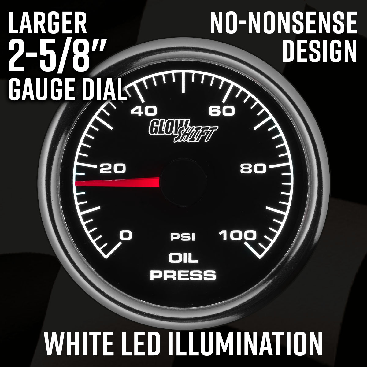 GlowShift 2-5/8 (65mm) Black & White Racing Series Gauges have a black gauge dial, flat clear lens and illuminated red needle with full 270 degree movement. Each analog racing gauge features ultra-bright white LED illumination for readings utilizing a through dial lighting system. This drag racing gauge delivers a combination of accurate readings and extremely smooth needle movement. Activate Nighttime Dimming Mode to reduce the brightness of the gauge by 30% for optimal viewing of readings after sundown.