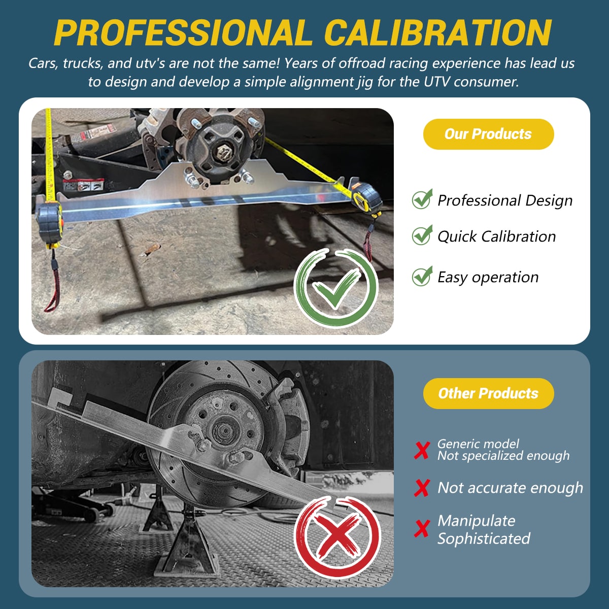 Cars, trucks, and utv's are not the same! Years of offroad racing experience has lead us to design and develop a simple alignment jig for the UTV consumer. Wether you are running down the highway, or setting up for racing, our kit will get you the best possible alignment without a digital alignment machine.