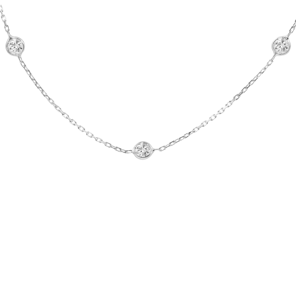 This high quality women's necklace features 10 round brilliant cut lab grown diamonds All diamonds are bezel set in solid 14k White gold. The necklace is 18" and features a lobster security.