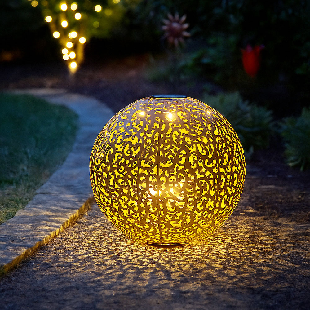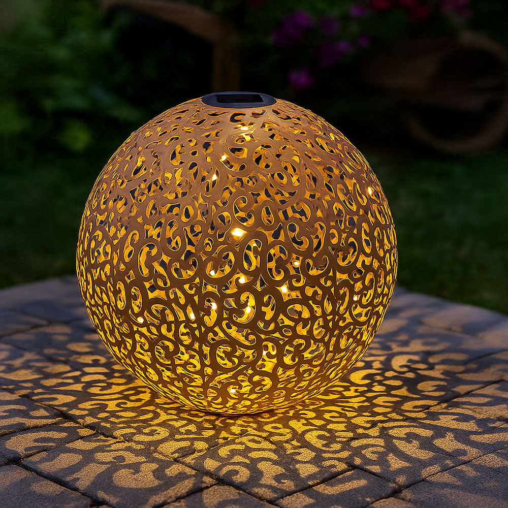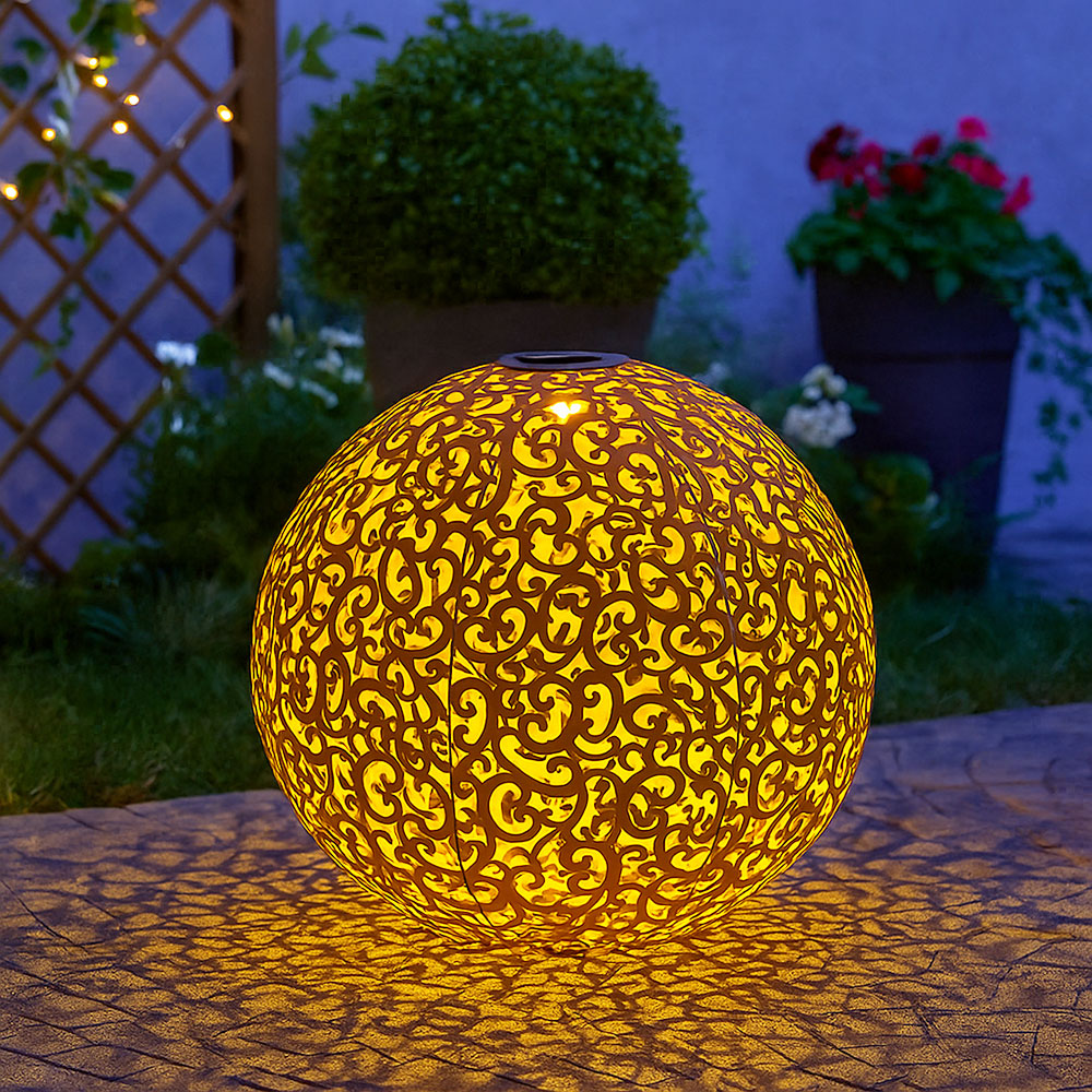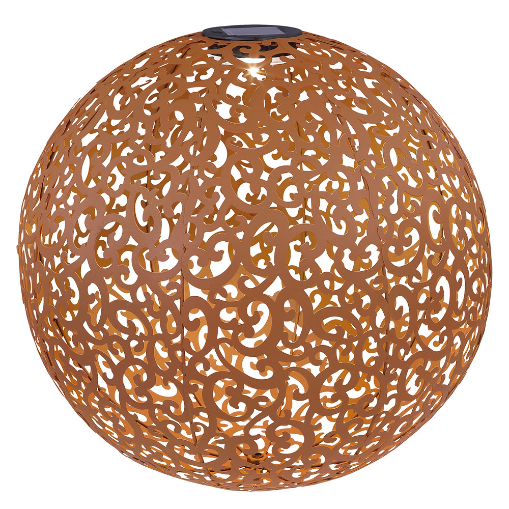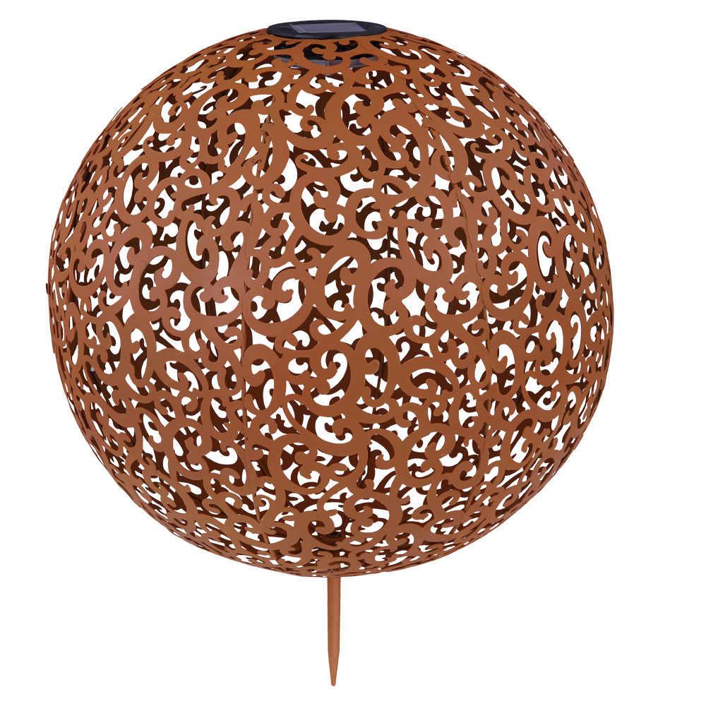 • Lampentyp: Solarleuchte • Design: Kugel mit Dekorstanzungen • Material: Metall • Farbe: rostfarben