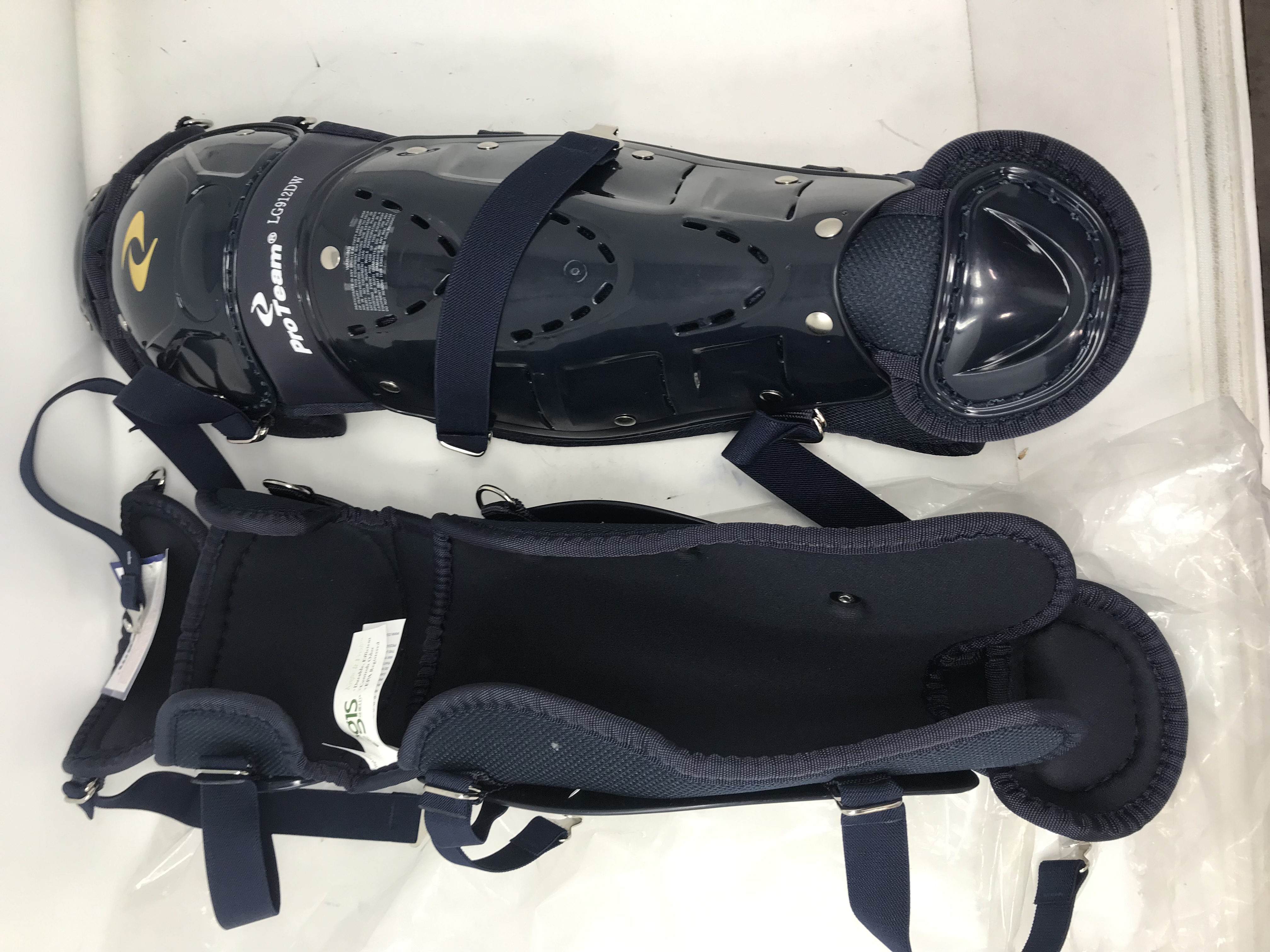 New Pro Team LG 912DW Catcher Leg Guard 12" Intermediate 9-12 Yth Baseball Navy 12 Inch age 9-12 Double knee design, with extra thick plastic in the knees to prevent cracking Full wing wrap around padding Traditional harness straps CLEANING: Scrub down in the tub / Cold water / mild detergent / air dry.