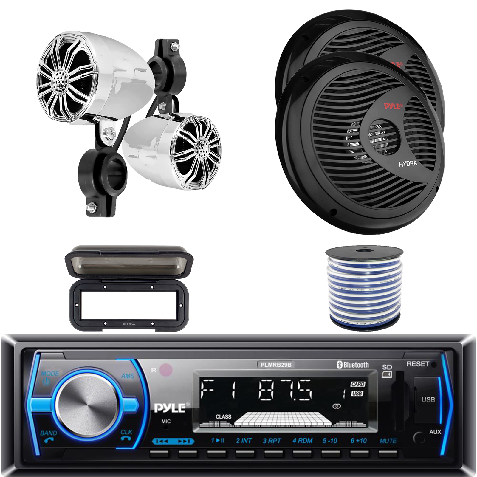• PACKAGE BUNDLE INCLUDES: Pyle PLMRB29B Single DIN Marine Bluetooth USB/AUX MP3 Player AM/FM Radio In-Dash Stereo Black Receiver w/Remote Control, Waterproof Tinted Radio Shield Black Receiver Cover, 2x Pyle PLMR22CR 2.25’' 10 Watt Max Power Waterproof Rated Full Range Off-Road Chrome Boat Speakers, 2x Pyle PLMR80B 8'' 180 Watt Max Power Waterproof Full Range Boat Black Stereo Speakers, 50 Feet 18 Gauge Speaker Wire