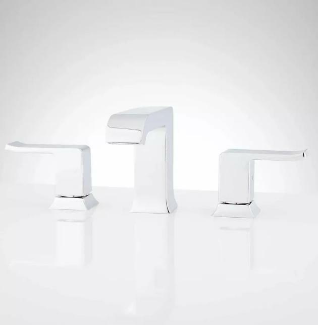 This modern faucet displays a uniquely shaped spout and coordinating lever handles, making it the highlight of your bathroom update. The Delite Widespread Faucet will complement a variety of bathrooms and includes a matching drain for a finished look.