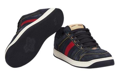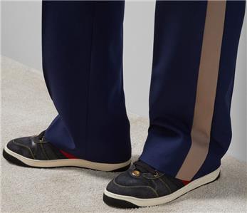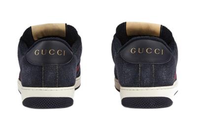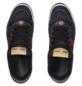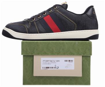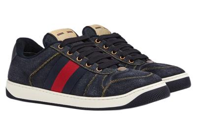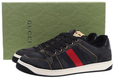 NEW IN BOX WITH DUSTERS GUCCI SCREENER MEN'S CURRENT BLACK DENIM WEB LOGO SNEAKER'S SHOES. MADE IN ITALY. 100% AUTHENTICITY GUARANTEED. SIZE G 7, US 7.5.