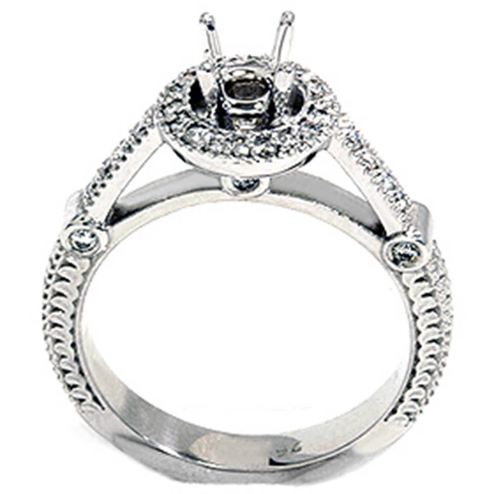 This stunning women's engagement ring setting features 32 round brilliant cut natural diamonds. All diamonds are set in solid 14K White Gold. The mount is ready to hold a .25-.65ct round diamond. .25ct total diamond weight.