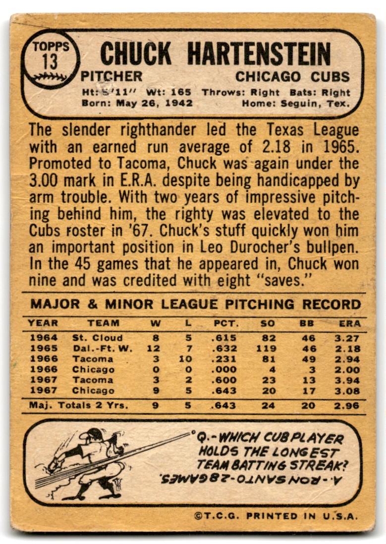 1968 Topps Chuch Hartenstein Chicago Cubs #13