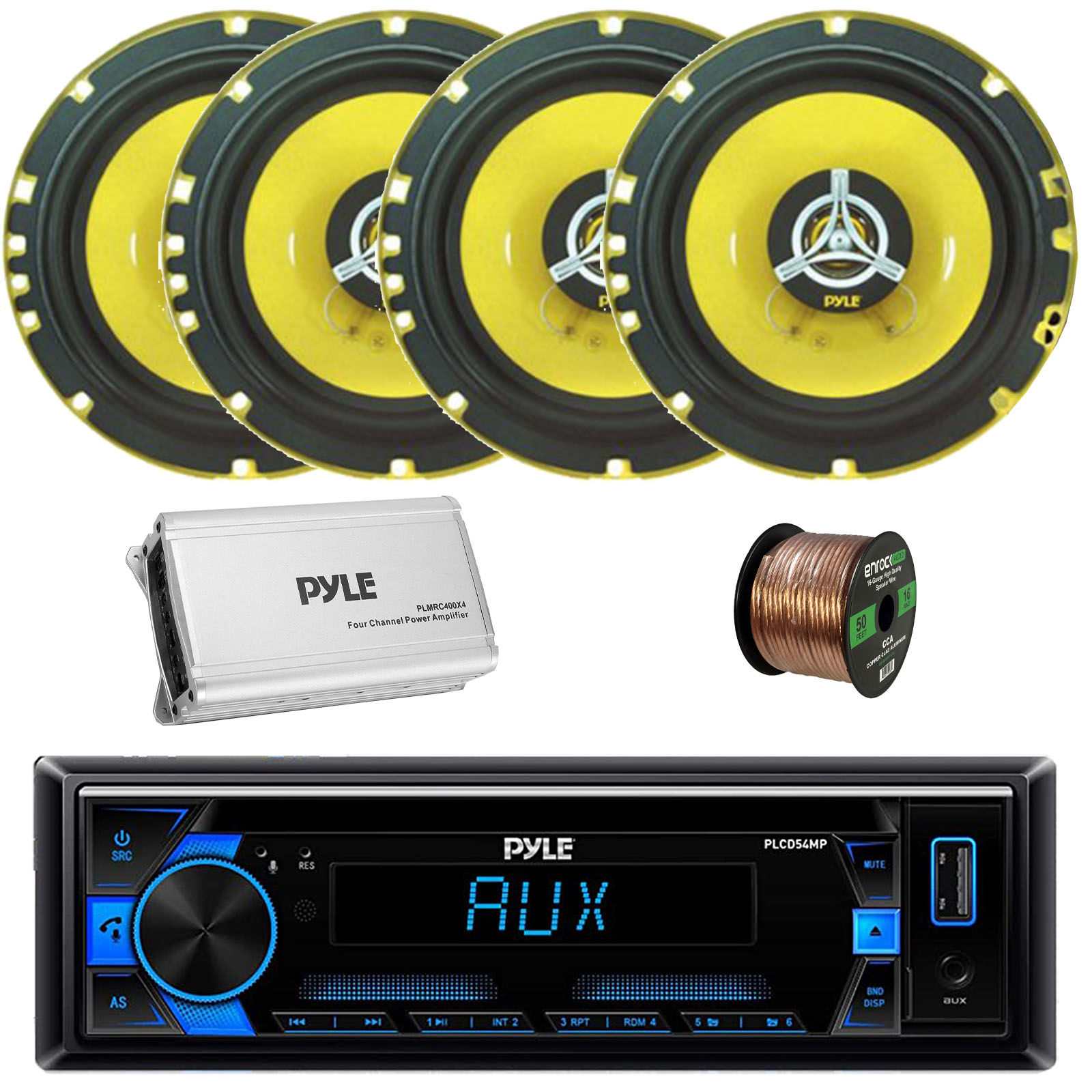 PACKAGE BUNDLE INCLUDES: Pyle PLCD54MP Single DIN AM/FM CD/MP3 USB/AUX Stereo Receiver, 4x Pyle PLG6.2 6.5'' 240 Watt Max Power 2-Way Car Audio Speakers, Pyle PLMRC400X4 4-Channel Weather-Resistant Class D Audio Amplifier, 50 Feet 16 Gauge Speaker Wire
