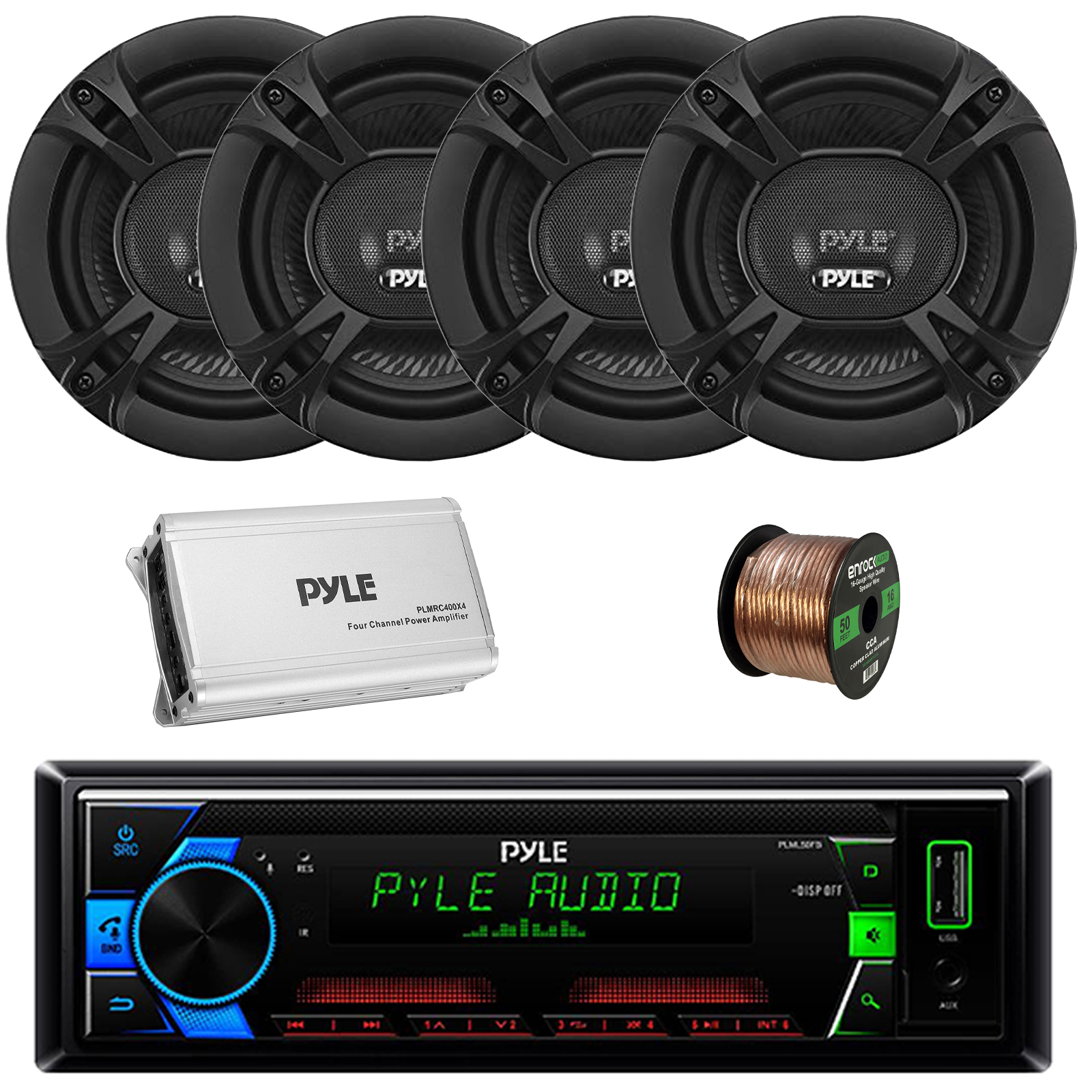 PACKAGE BUNDLE INCLUDES: Pyle PLML50FB Single DIN AM/FM MP3 USB/AUX Stereo Receiver, 4x Pyle PL613BK 6.5'' 300 Watts 3-Way Triaxial Speakers, Pyle PLMRC400X4 4-Channel Weather-Resistant Class D Audio Amplifier, 50 Feet 16 Gauge Speaker Wire