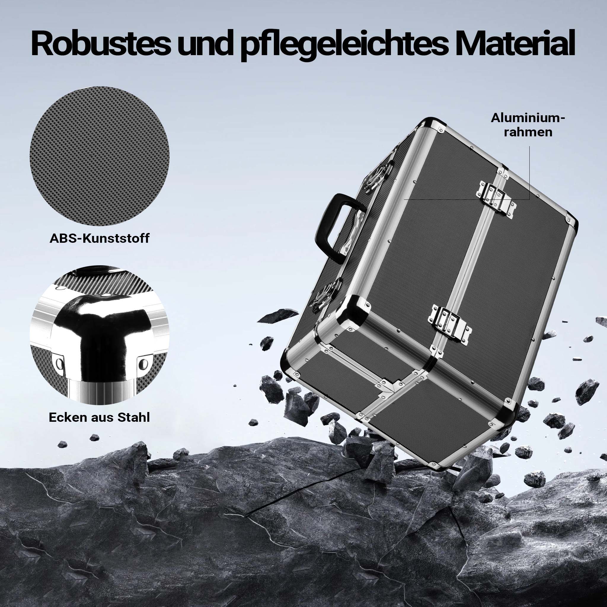 Dieser Aufbewahrungskoffer besteht aus robustem ABS-Kunststoff und Aluminium, was ihm eine hohe Stabilität und Widerstandsfähigkeit verleiht. Die verstärkten Ecken aus Stahl bieten zusätzlichen Schutz und verhindern Beschädigungen, selbst bei intensiver Nutzung. Der stabile Haltegriff sorgt für einen sicheren und bequemen Transport, während die abschließbare Konstruktion mit zwei Schlüsseln die Sicherheit Ihrer Ausrüstung gewährleistet.