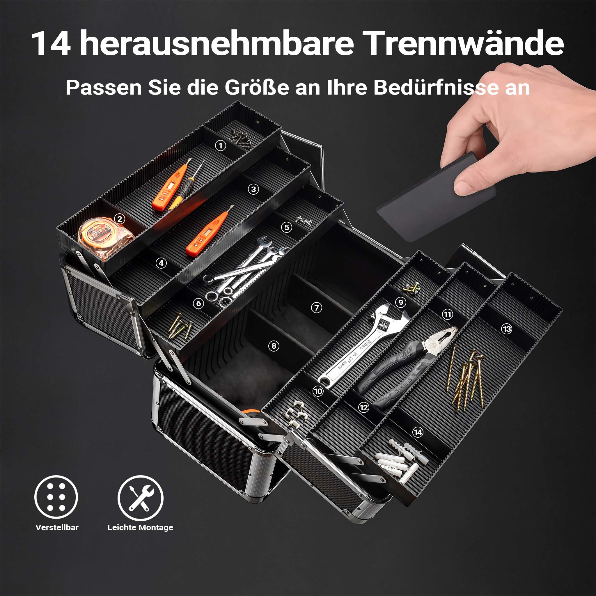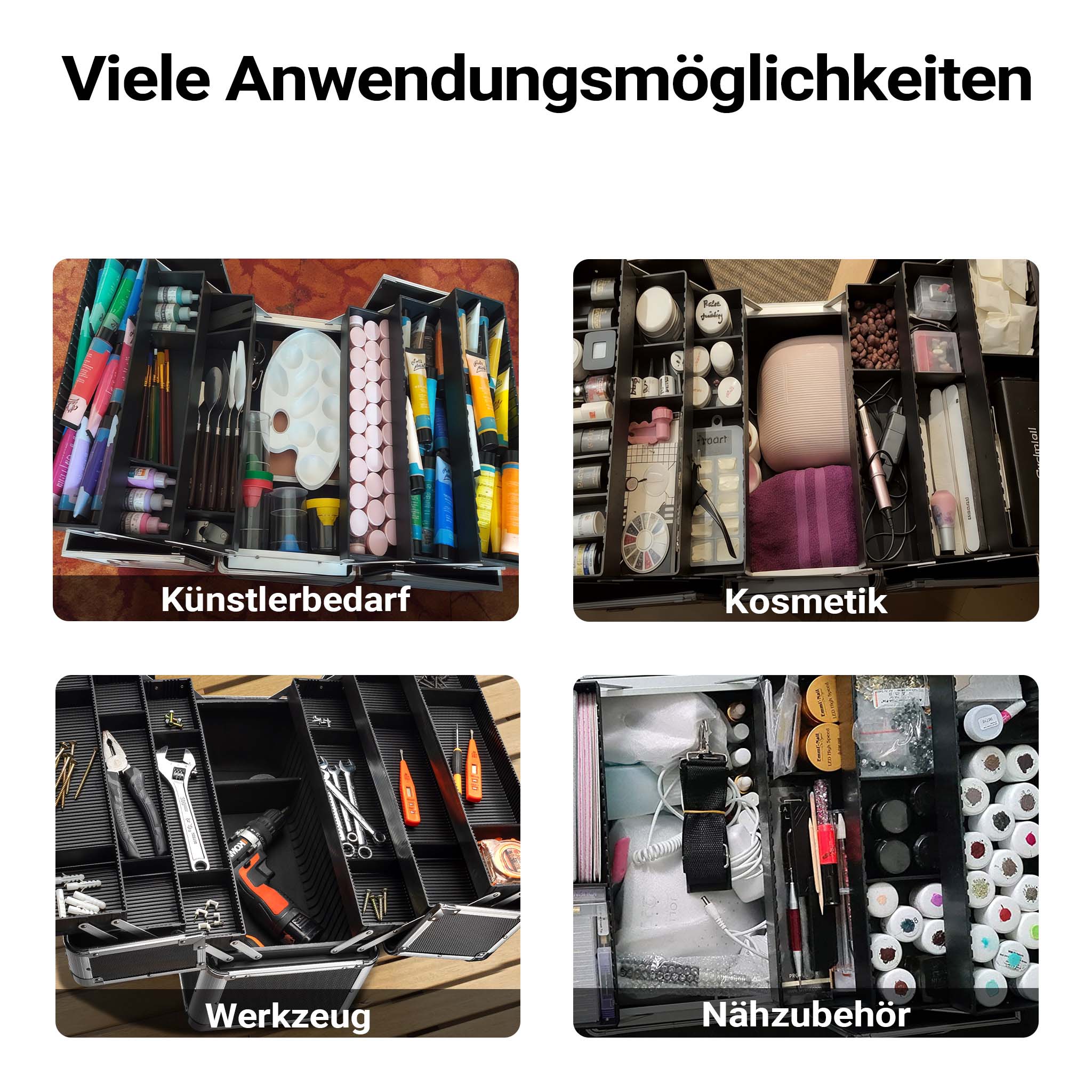 Der Innenraum des Universalkoffers ist mit Klappfächern und Einteilern ausgestattet, die eine organisierte und übersichtliche Aufbewahrung ermöglichen. Diese durchdachte Innenaufteilung ist besonders nützlich für die Aufbewahrung von Werkzeugen, elektronischen Geräten, Schmuck, Schminke und anderen kleinen Gegenständen, die sicher und geordnet transportiert werden müssen.
