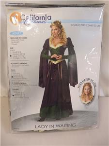 Lady in Waiting Renaissance Medieval Princess Queen Womens Costume. Large (10-12)Item includes: Dress with faux underskirt, crown only. Picture Items not included: Shoes. This is an officially Licensed California Costumes Product. Care Instructions: Hand wash in cold water, hang to dry.