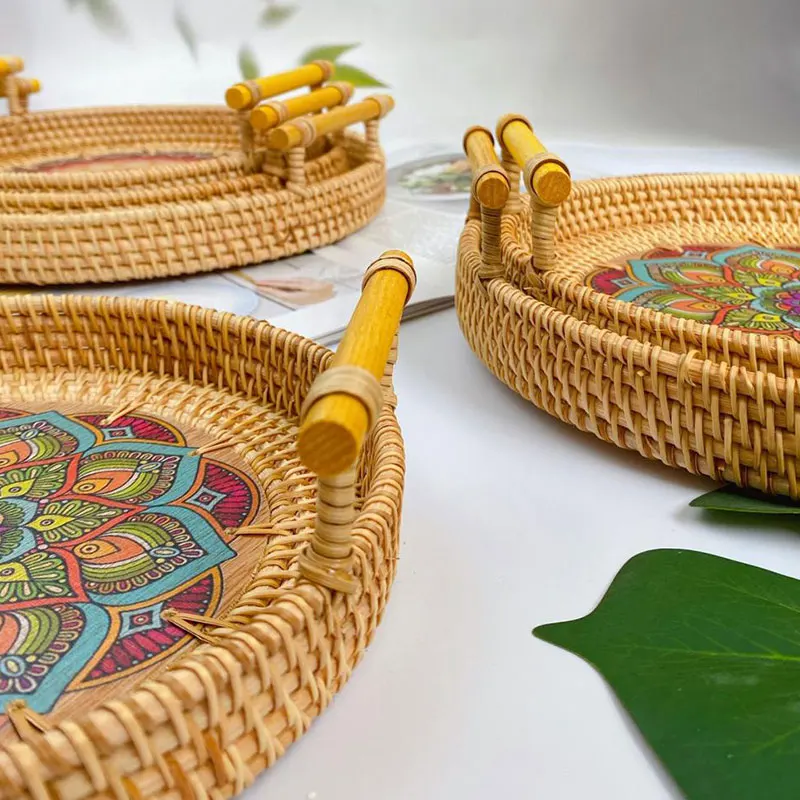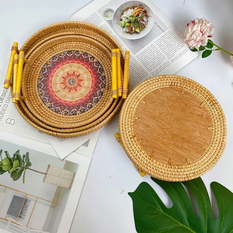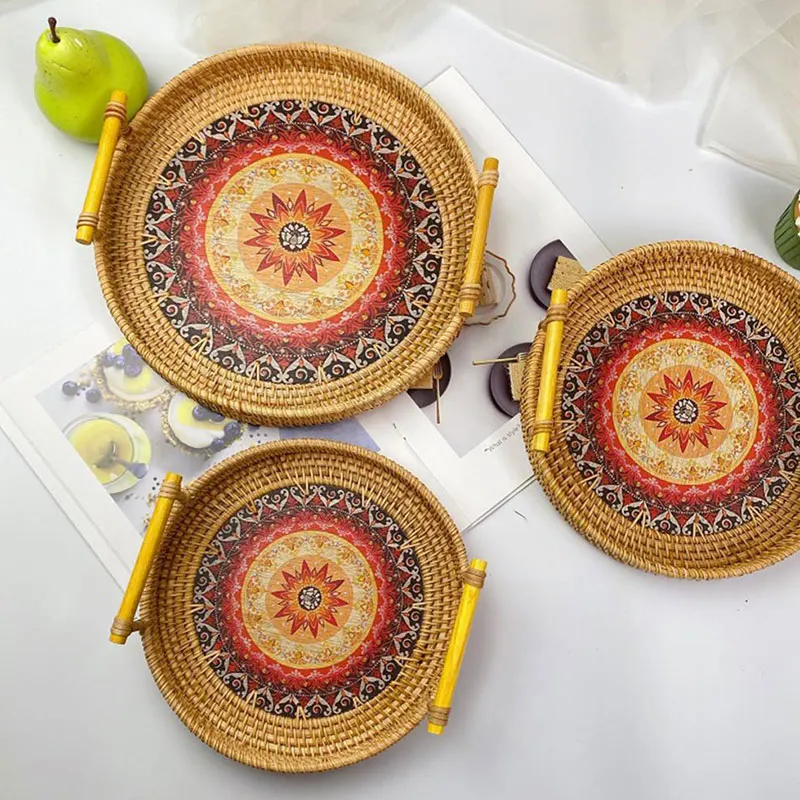 Creative Round Rattan Woven Storage Tray Basket W/ Handle Fruit Snack Container