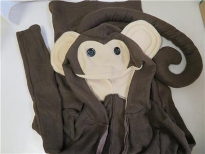 Zipper-front fleece dress with cheeky banana accent; Attached long curly tail; Funny face hood with silly ears; Socks and shoe apes not included