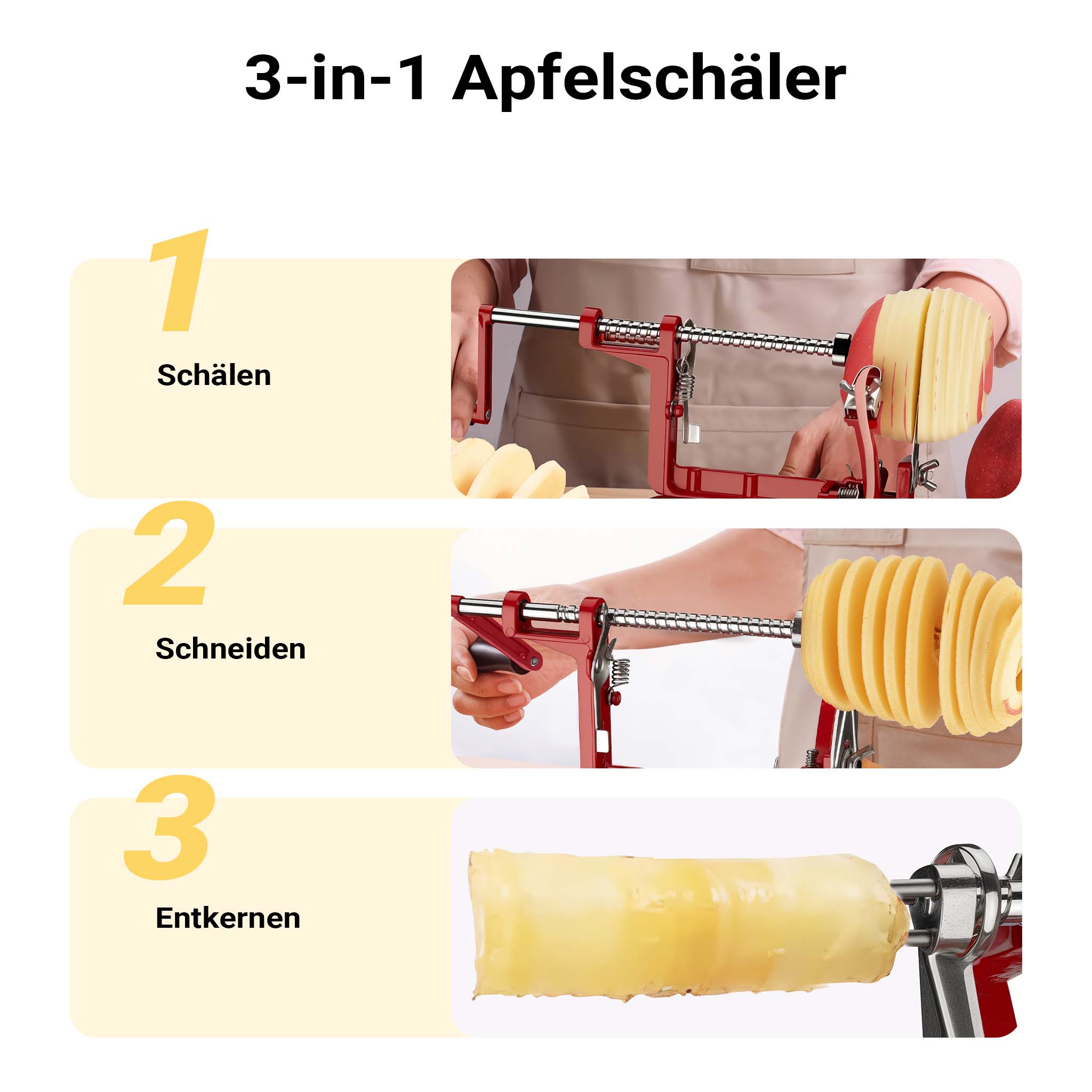 Der Apfelschäler 3 in 1 ist vereint die Funktionen von einem Schäler, Apfelausstecher und Apfelteiler – innerhalb weniger Sekunden haben Sie einen perfekt geschälten, entkernten und geschnittenen Apfel.