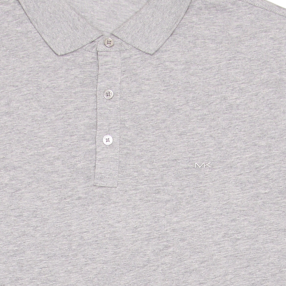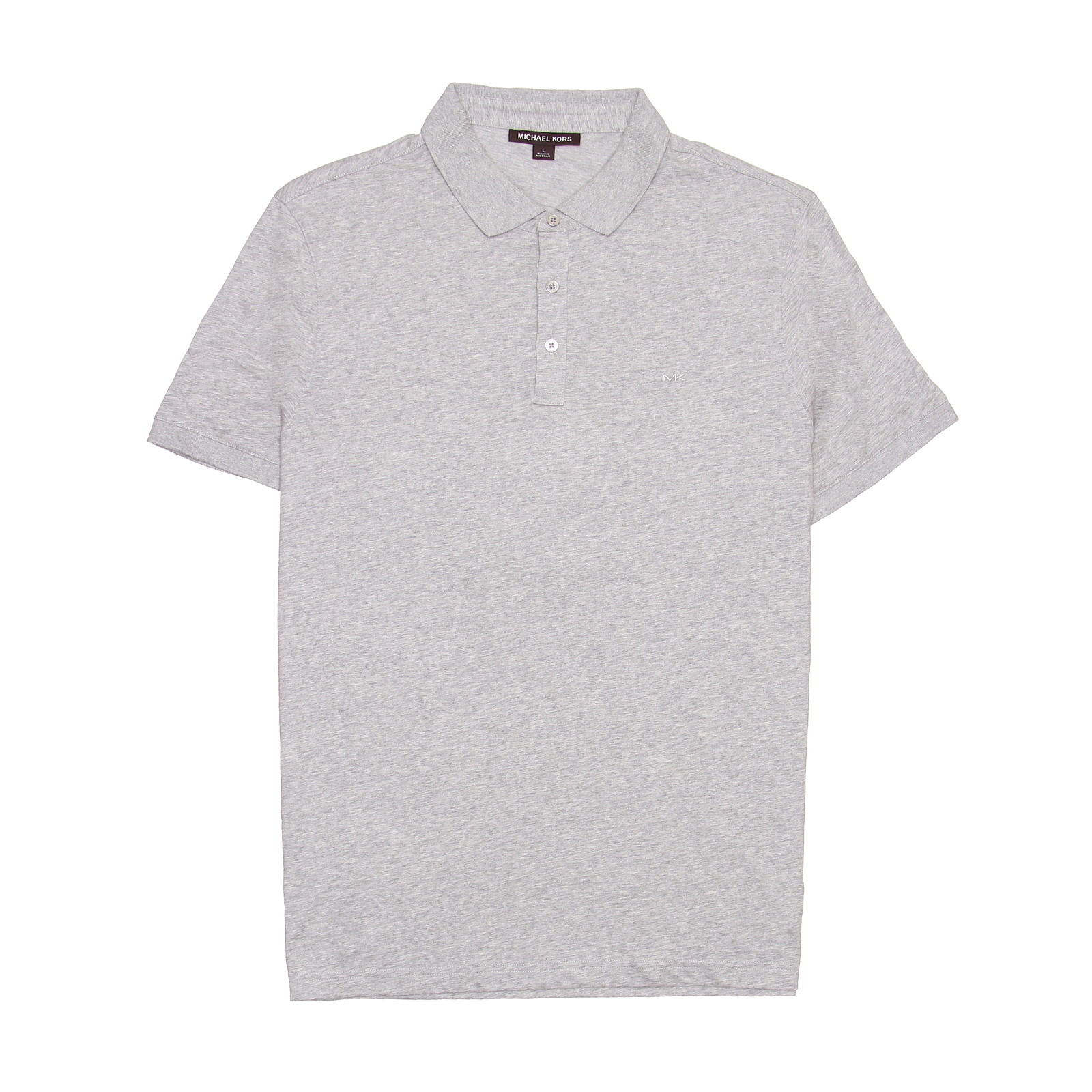 • Look and feel your best in the Michael Kors Men's Heather Gray Embroidered Polo Shirt. This polo shirt is made from 100% cotton and features a classic heather gray color with embossed buttons, metallic buttons, and embroidery. The polo also has a placket front, spread collar, and banded cuffs.