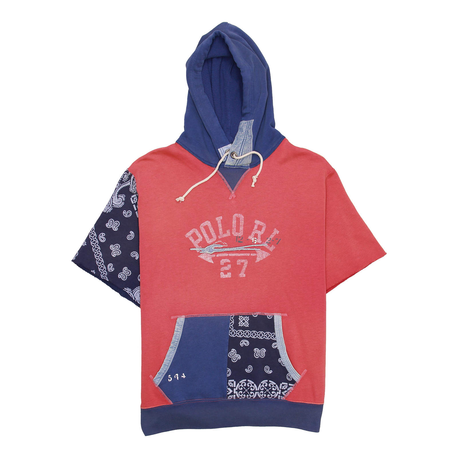 This Polo Ralph Lauren men's red/blue patchwork fleece distressed cuffs hoodie is the perfect way to add a touch of vintage style to your wardrobe. It is made with a soft and comfortable cotton blend fabric and features a hoodie, short sleeves with rolled and distressed cuffs, and a banded hem. The hoodie also has one pass-thru lower front pocket for storing your essentials.  ****  Care: Machine Wash (Cold)  ****  Material: 87% Cotton/ 13% Polyester  ****  Cuff Style: Rolled Cuffs  ****