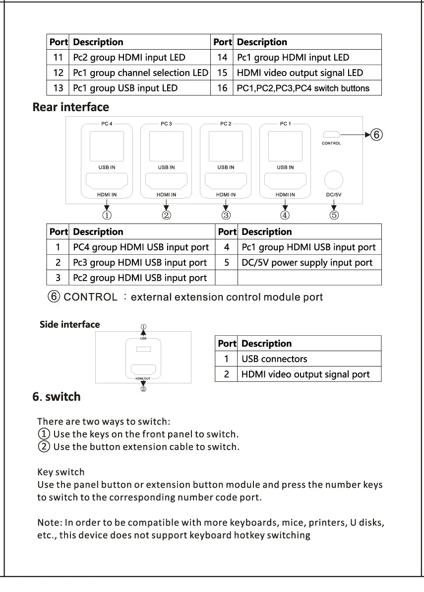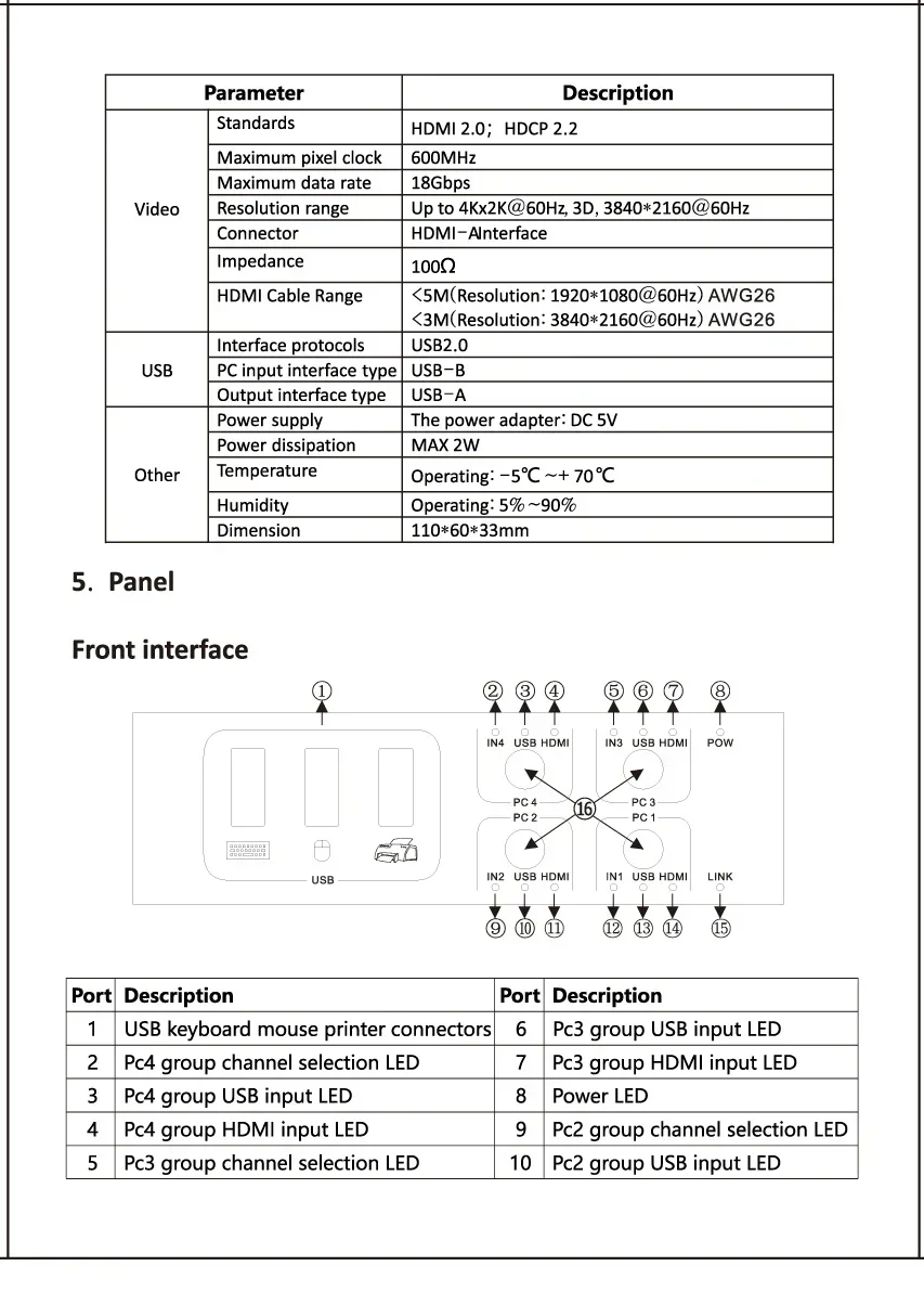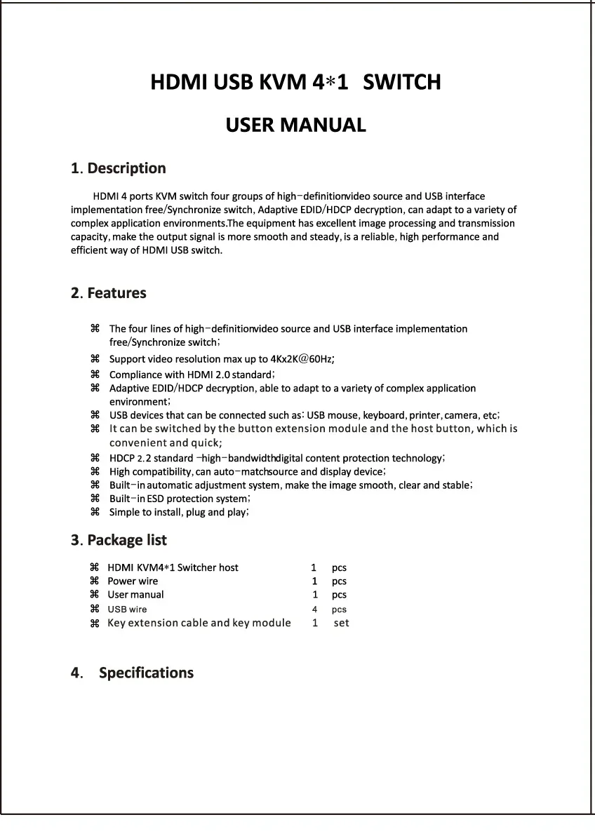Item type: 4K 4x1 HDMI USB KVM Switch (USB 2.0 Interface)