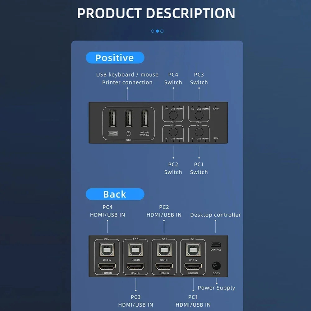 Four port HDMI input and 1 output 4K@60HZ clear picture quality. Support 4Kx2K high-definition resolution clear