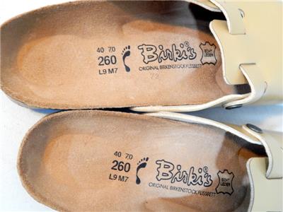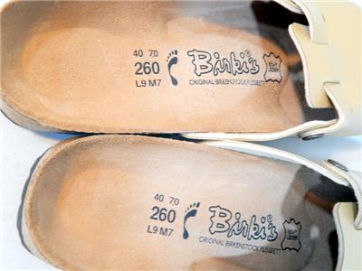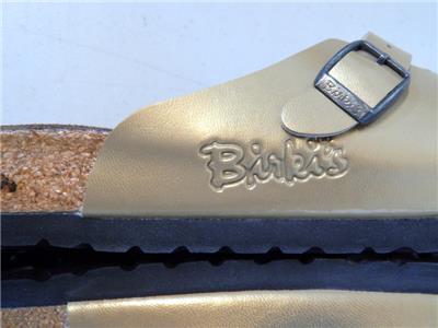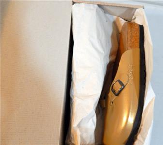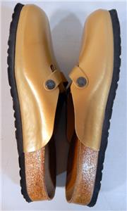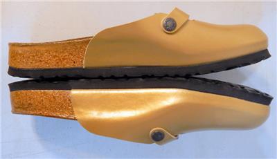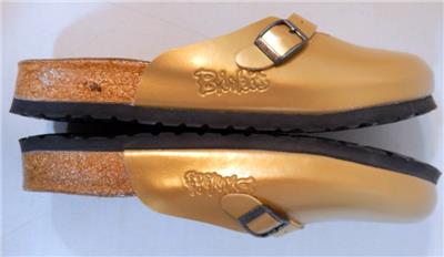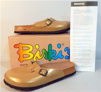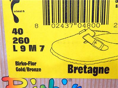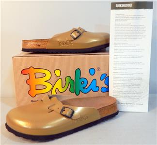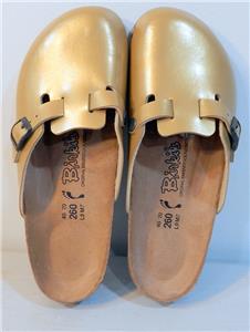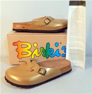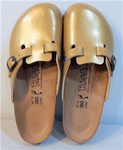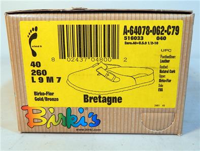 Offered for your consideration is a NIB (new in box) pair of Ladies Birkenstock Bretagne adjustable comfort clogs/mules. This is a pair offered in a metallic golden bronze color. They are a European size 40, which fits a women's U.S. size of 9 1/2 to 10 and are of a medium width. Please note that the Birkenstock size 40 made today are a size 9-9 1/2....these were manufactured before the change. They are also medium width, today now offers a medium AND a narrow width. The shoes are made of their iconic Birko-Flor upper, which is synthetic, with a leather look. They have a molded design footbed, with a deep heel cup, arch support and toe bar. The clogs have a buckle closure, which allows for adjustability for comfort of the wearer. Step into style with this pair of clogs from Birkenstock! Since these are in new, unused condition, I will not accept returns on this item. Thank you for viewing my listing.