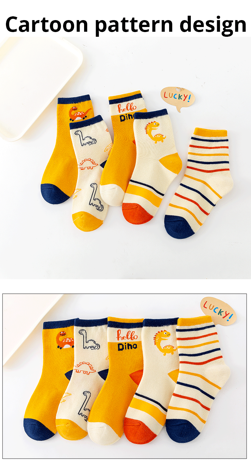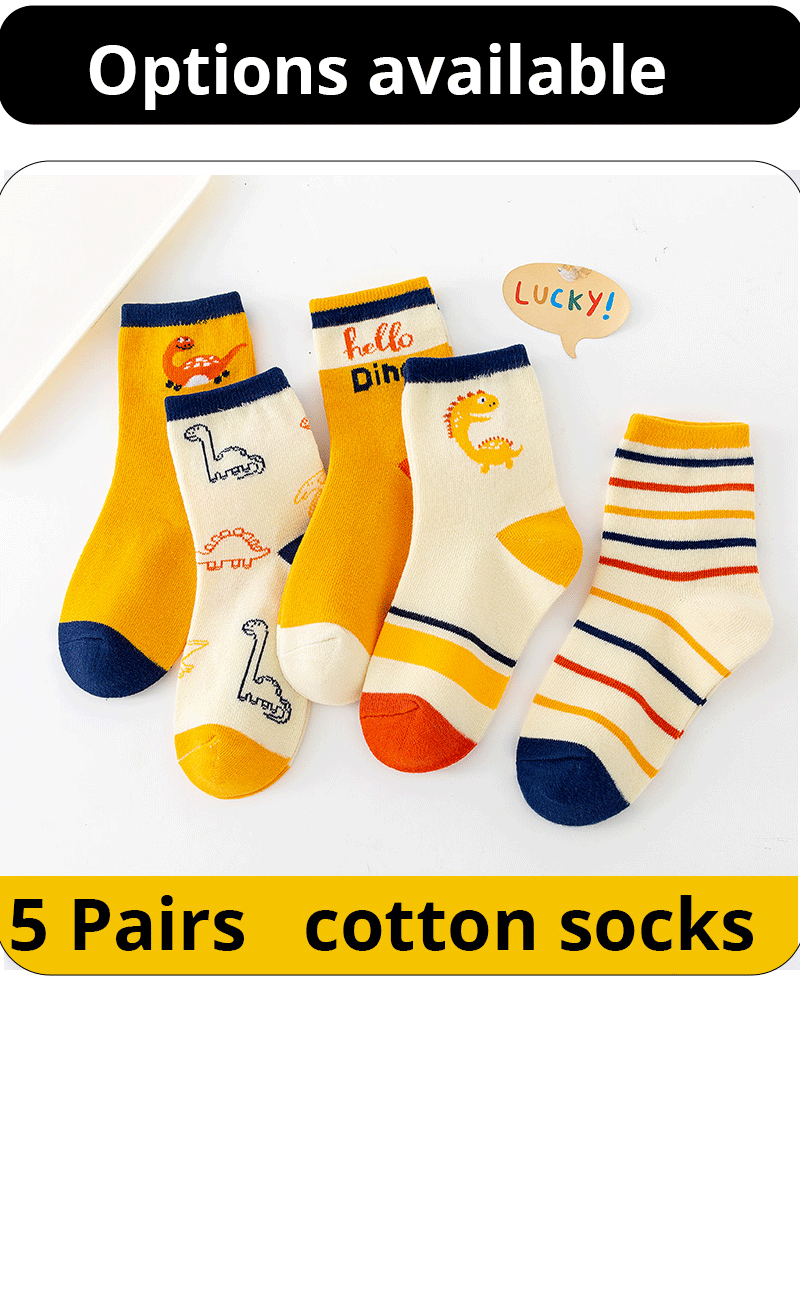5 Pairs Children's Socks Pure Cotton Cartoon Dinosaur - Casual Footwear For Boys