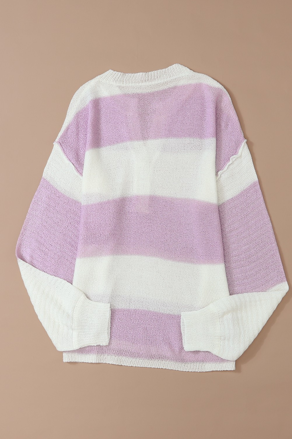 Elevate your winter wardrobe with our Lilac Stripes Knit Button Ribbed Sweater, a cozy yet stylish addition that combines classic design with modern flair. This sweater features: