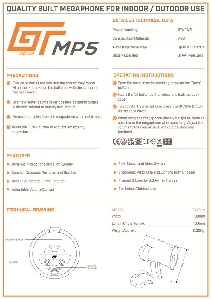 Our smallest megaphone is an extremely convenient, compact handy size, at just 160mm in length. Featuring a tactile rotary control for volume and a built in siren. The unit takes easily available and inexpensive AA cells.