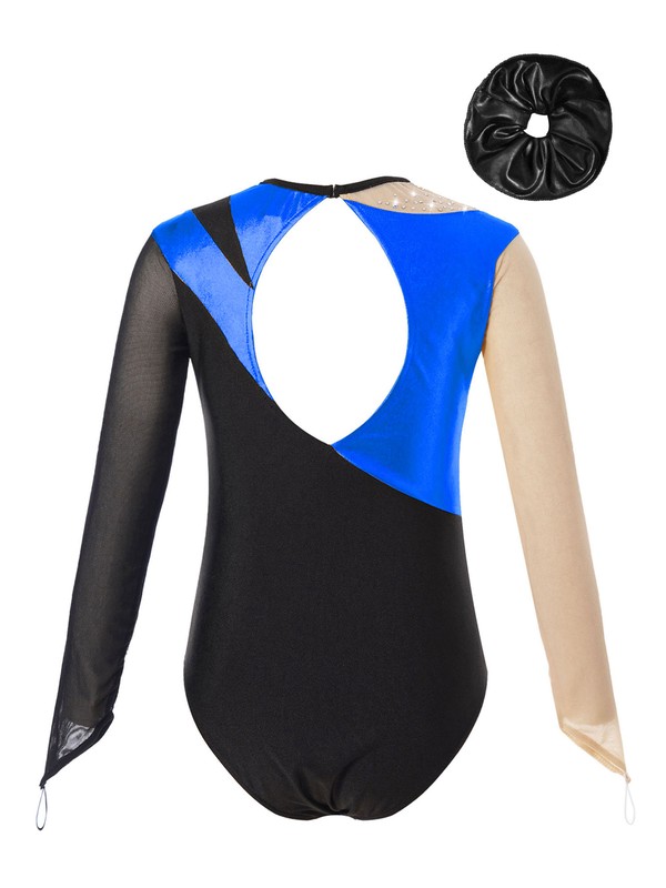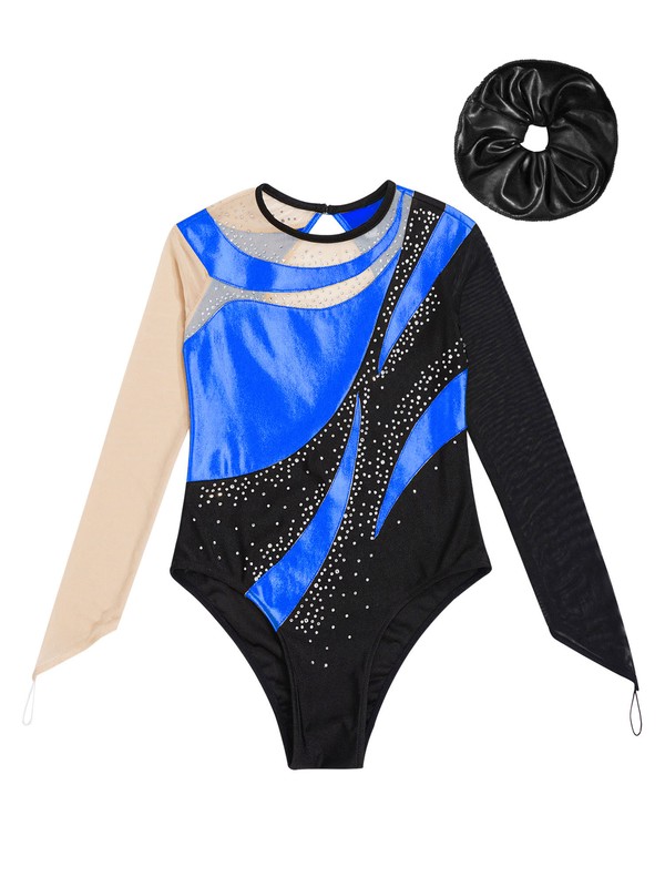 Contrast design leotard, see-through mesh and metallic cloth patchwork intersperses shiny rhinestone details.