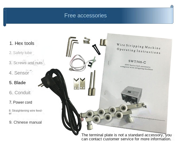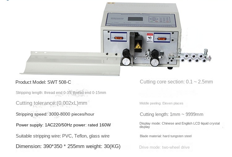 Hot Automatic Wire Stripper 220V Fast Speed Wire Stripping Machine SWT508C Operation: 1.Press the up or down arrow to move the cursor to select a program (01 - 89 for routine procedures, and 90 - 99 for ultra short wire programs) 2.Set the length of wire stripping (Unit: mm) 3.The value of the stripping is set on the end of the wire, and the stripping value at the back is greater than the end of the line, that is, full stripping, and less than is half stripping 4. 3 is also for the start of the wire