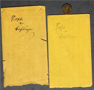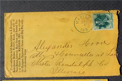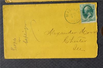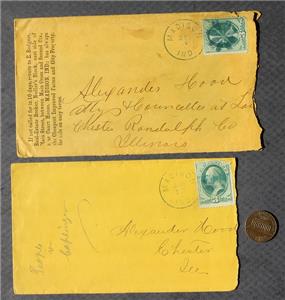 Check it out...Here's a ONE-OF-A-KIND set of 2 (TWO!) 1880s Era postal cancels / envelops from Madison Indiana to Chester Illinois. One is dated Sept. 6 from Madison with the handwritten address of lawyer: "Alexander Hood Atty + Councillor (Sic) at Law Chester Randolph Co. Illinois" with a George Washington green 3 cent stamp intact and a legal disclaimer at the side and the other is postmarked  Aug. 10 from Madison and both are ID'd as "People V. Caplinger"-How cool is that? Could be a real sleeper fun to research-Great vintage historic set. How many of these survived? These are ORIGINAL items...Not reproduction items! Postage information is listed at the bottom-$ 5.95 postage is required.
