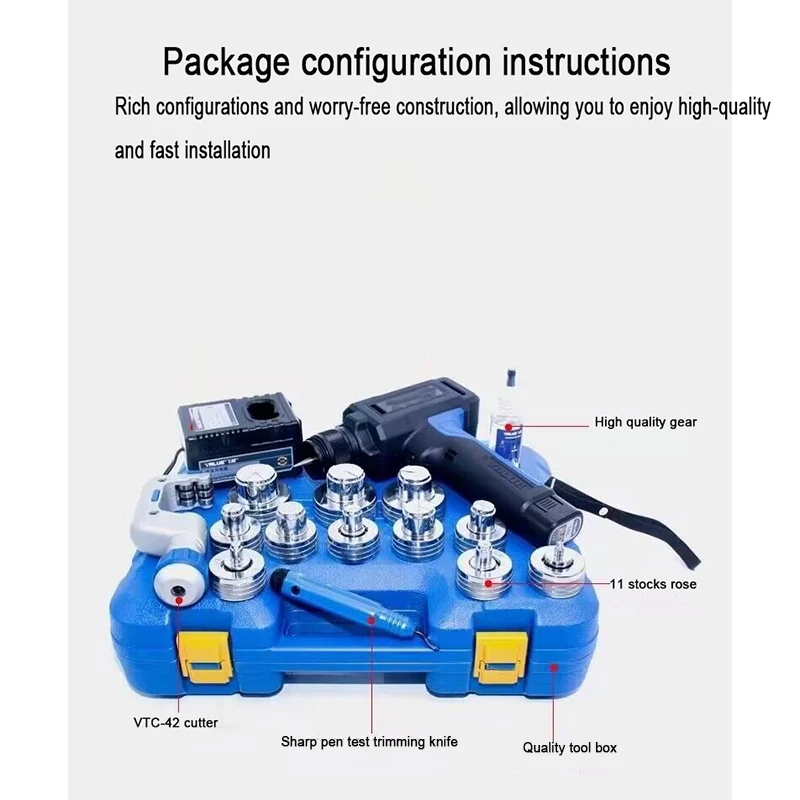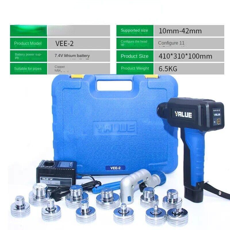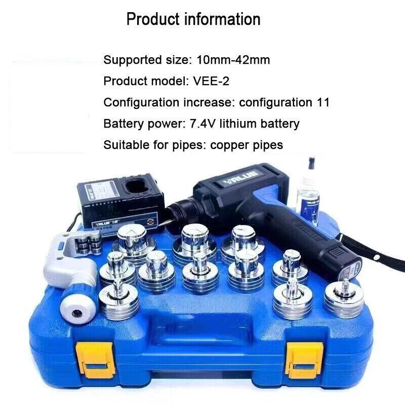 Support size 10mm-42mm Product Model VEE-2 ConfigurationRising head configuration11pcs Battery power 7.4V lithium battery Product size 410*310*100mm Suitable for copper pipe Product weight 7.5KG