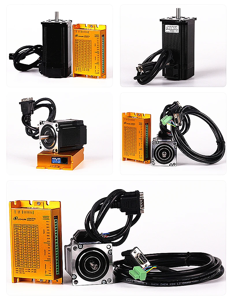 Servo motor driver LCDA357H +Nema23 stepper motor 57 with encoder with 3M cable for CNC Router LCDA357H Features: Input voltage range: 18-50 VDC Maximum peak current: 7A Subdivision range: 200-51200ppr Signal Input: Differential/Single-Ended, pulse/direction Impulse response frequency: 200KHz The electrical parameters of automatic tuning function Closed-loop vector control to ensure the motor speed high torque output, while ensuring that the motor does not lose steps Overvoltage,overcurrent, tracking error over poor protection