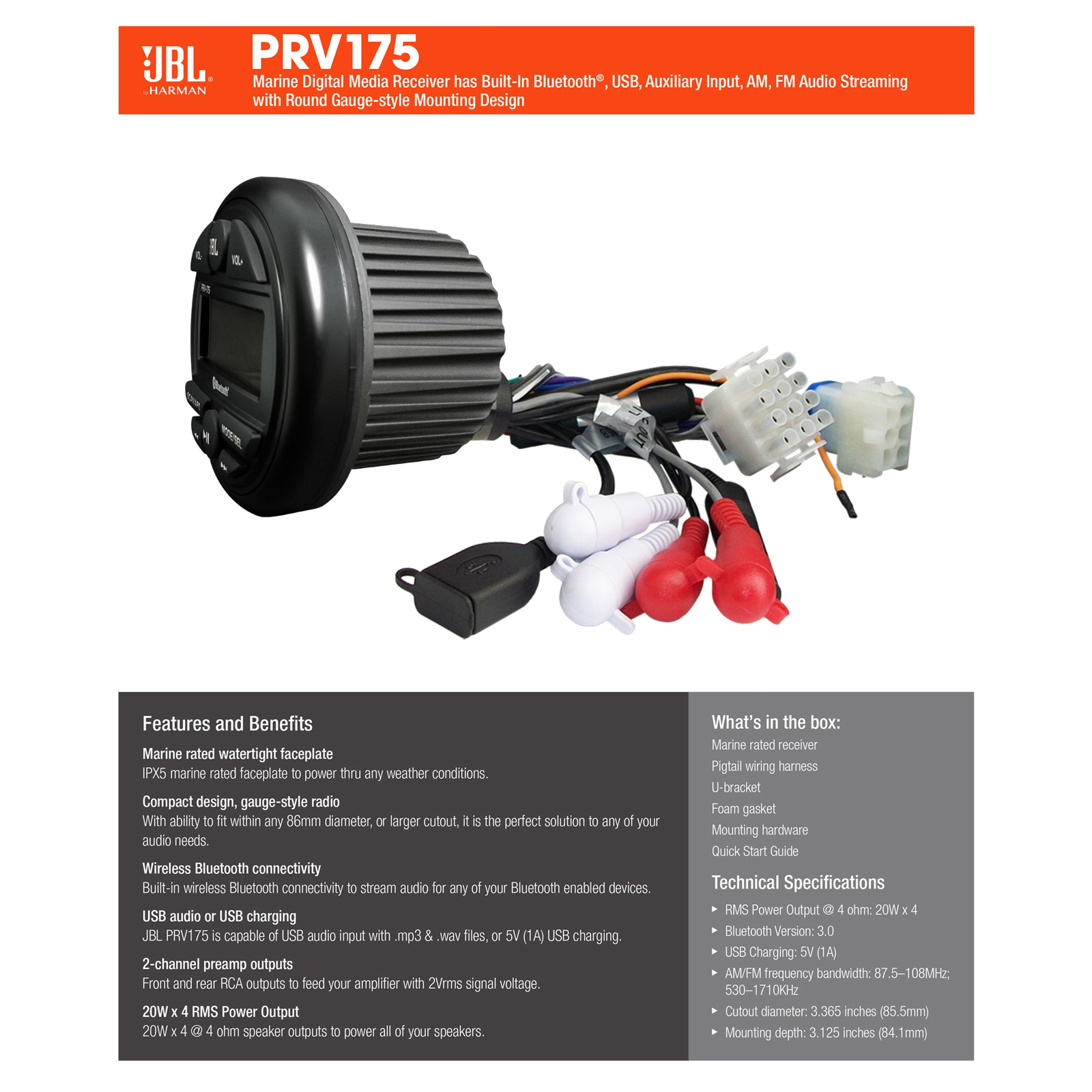 • RECEIVER: JBL PRV175 Bluetooth USB Marine Gauge Style Stereo Receiver is made with a IPX5 marine rated faceplate to protect against any weather condition featuring built in Bluetooth for audio streaming, USB input and AUX inputs, AM/FM tuner.