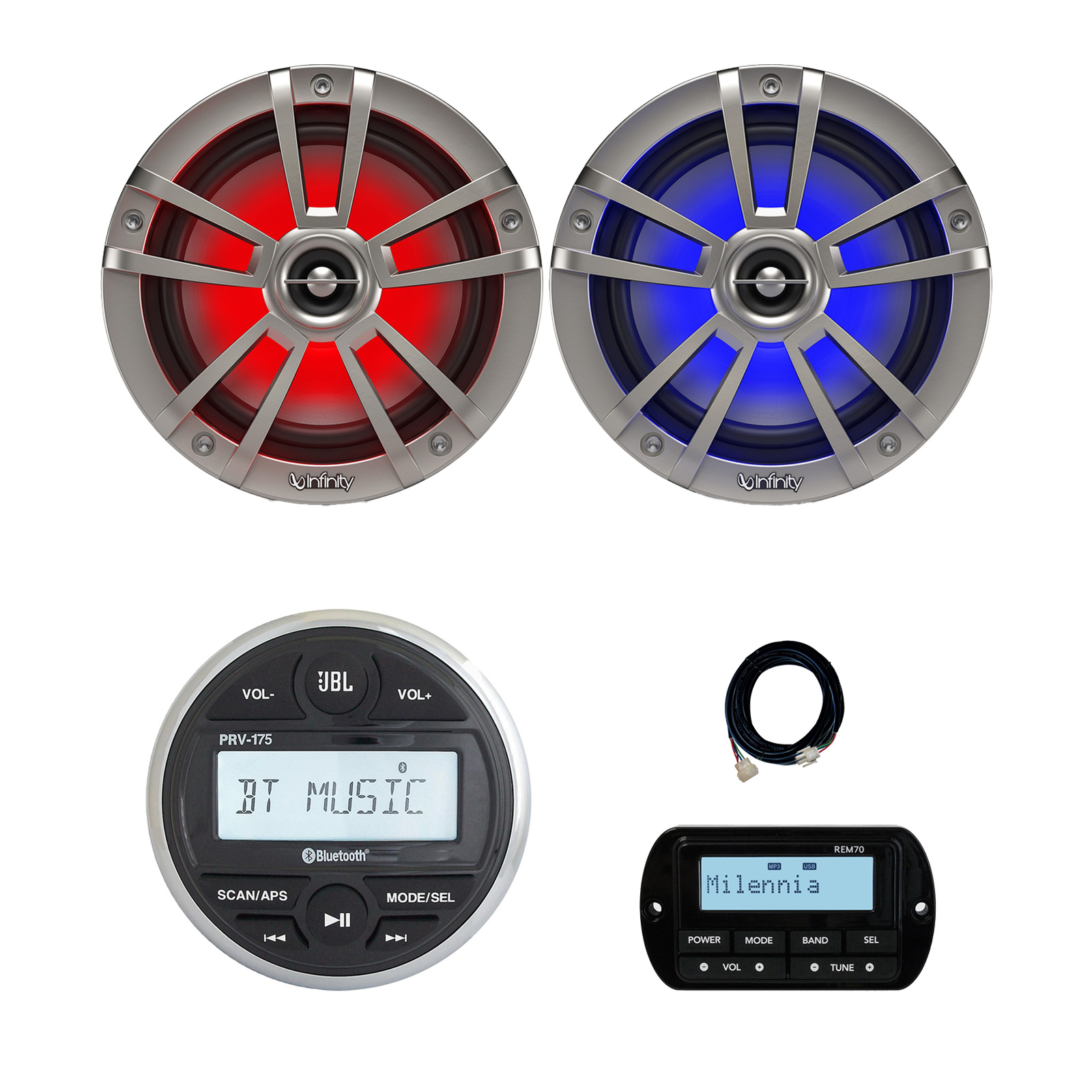 • PACKAGE BUNDLE INCLUDES: JBL PRV-175 Marine Gauge Hole Mount USB Bluetooth AM/FM Digital Stereo Receiver with Wired Remote, Extension Cable, 2x 6.5" 225 Watt 2-Way Multicolor LED Boat Audio Speakers (Titanium, Bulk Packaging)