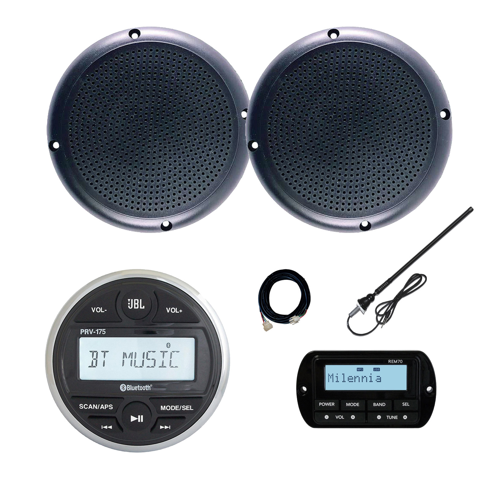 JBL PRV-175 Marine Gauge Hole Mount USB Bluetooth AM/FM Receiver, Wired Remote, Extension Cable, 2x 5.25" 20 Watt Max Power Polycone Audio Speakers, Long Range Antenna (Black, Bulk Packaging)