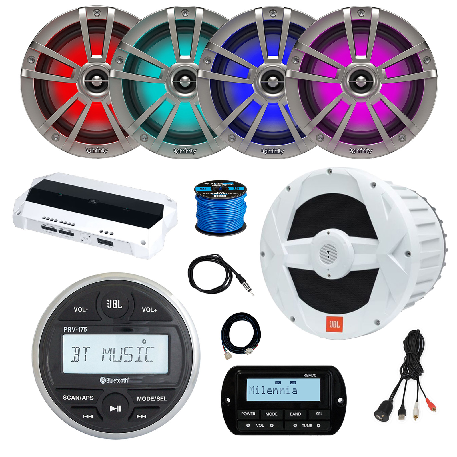 • PACKAGE BUNDLE INCLUDES: JBL PRV-175 Marine Gauge Style USB Bluetooth AM/FM Receiver, Wired Remote, Extension, 4x 6.5" 225W LED Speakers (Titanium), 10" Subwoofer , Amplifier, Antenna, USB Adapter, Wire (Bulk Packaging)