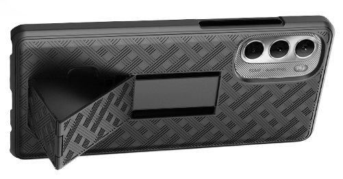 CASE KICKSTAND: Back of the case features built-in kickstand. Unsnap the hinge then slide downward until the kickstand snaps into place. Now you can prop your phone in different positions at your desk. Horizontal - This is ideal for watching movies and videos. Vertical - This is a handy prop for those "face-to-face" handsfree video calls.