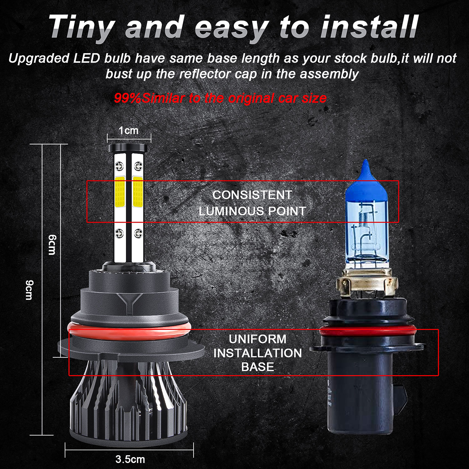 5 Mins Fast Installation -- Almost 1:1 mini size as halogen bulbs ensure fast and easy installation. NO modifications troubled, NO professionals needed. NO polarity requirement.