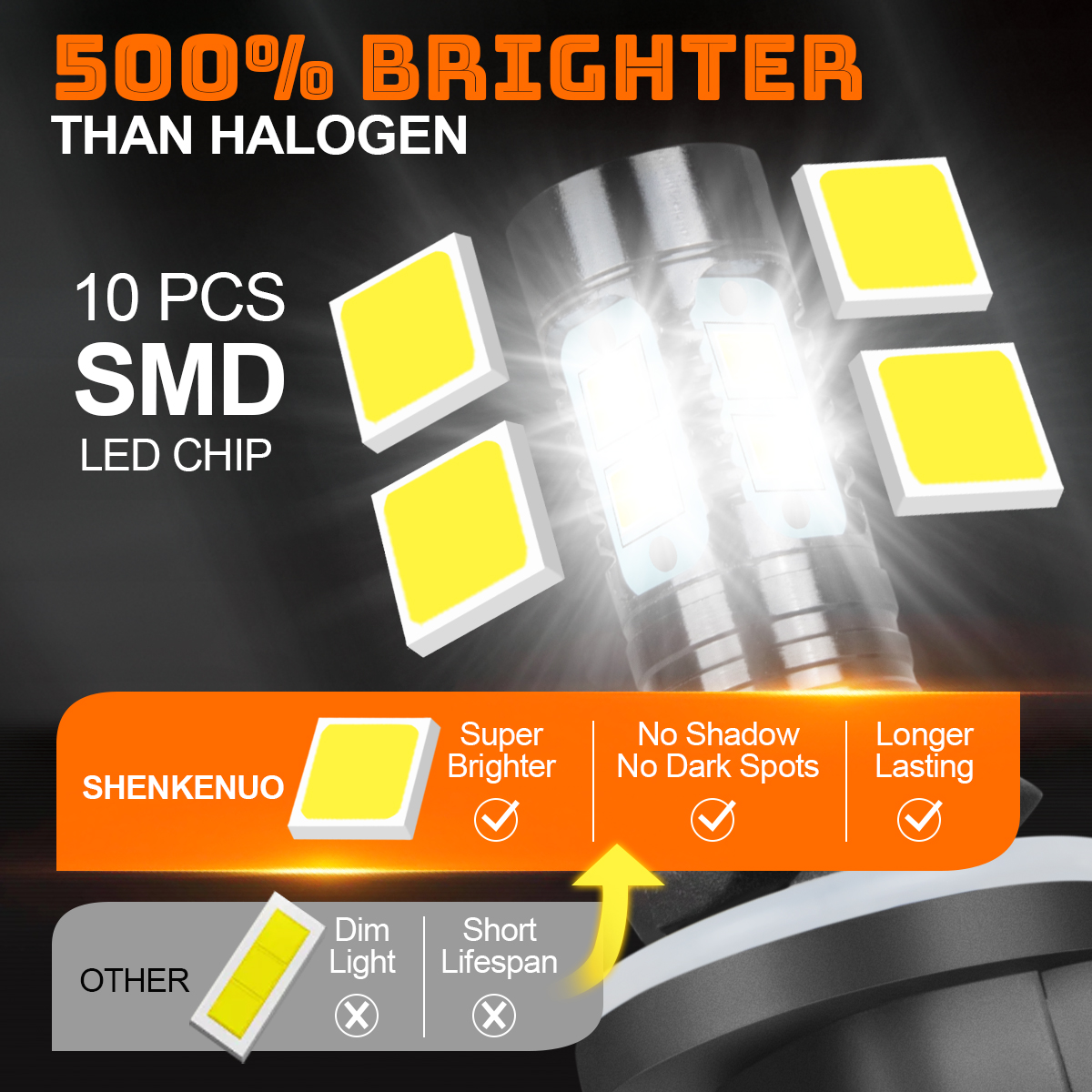 Upgraded Brightness -- Impress you with super brightness, lighting up the whole road! Highly efficient lighting surpasses 98% of normal bulbs, SHENKENUO X15 9007 880 bulbs combo can keep a high level of visibility and lighting experience.