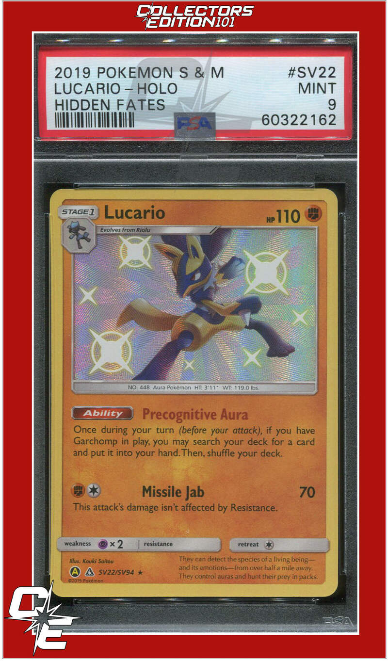 2019 Pokemon Sun & Moon Hidden Fates SV22 Lucario Holo MINT 9 - POPULATION 718 as of 10-16-2022