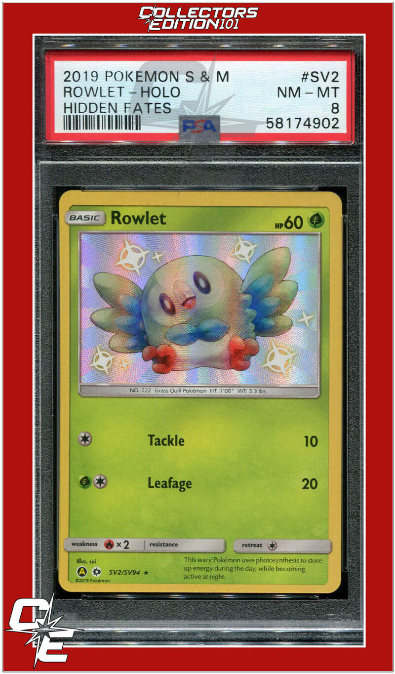 2019 Pokemon Sun & Moon Hidden Fates SV2 Rowlet-Holo NEAR MINT-MINT 8 - POPULATION 73 as of 7-4-2022