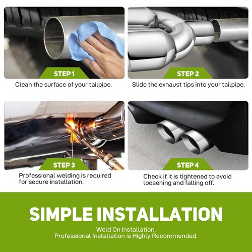 Maintenance tips: please routinely clean off the debris, cement, oil, dust and dirt on the surface or the interior of the exhaust tips since good maintenance ensures a longer service life of exhaust tips (NOTE: Professional installation would be highly recommended)
