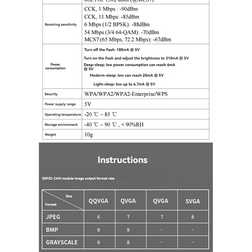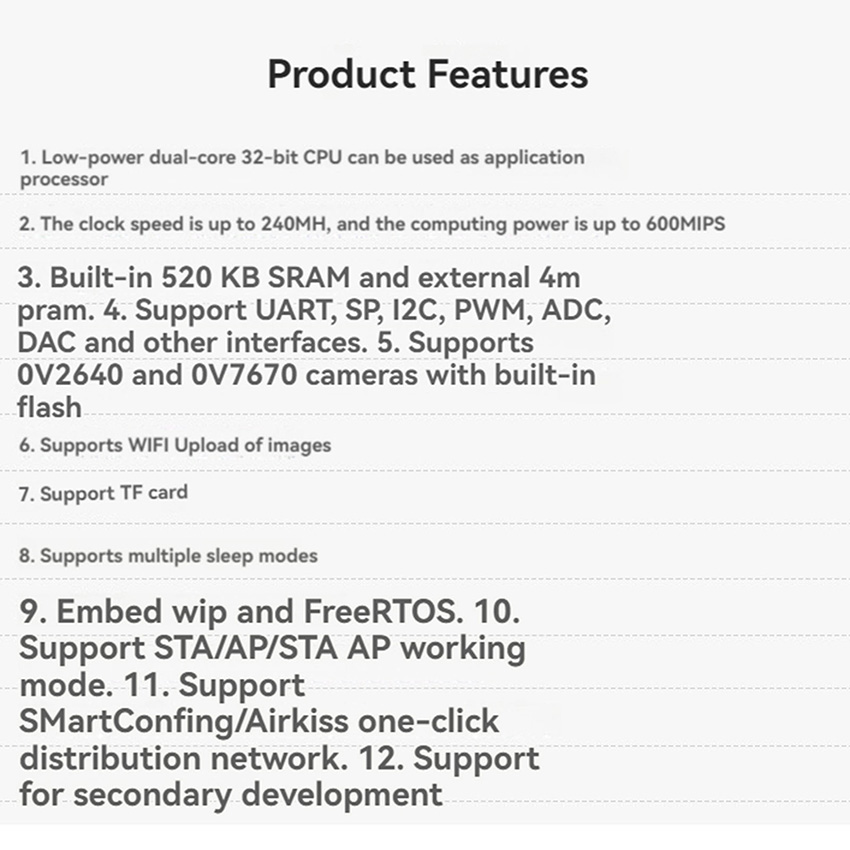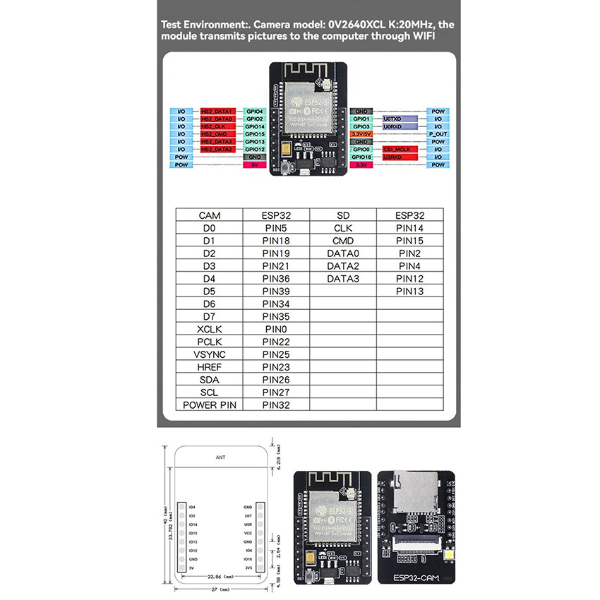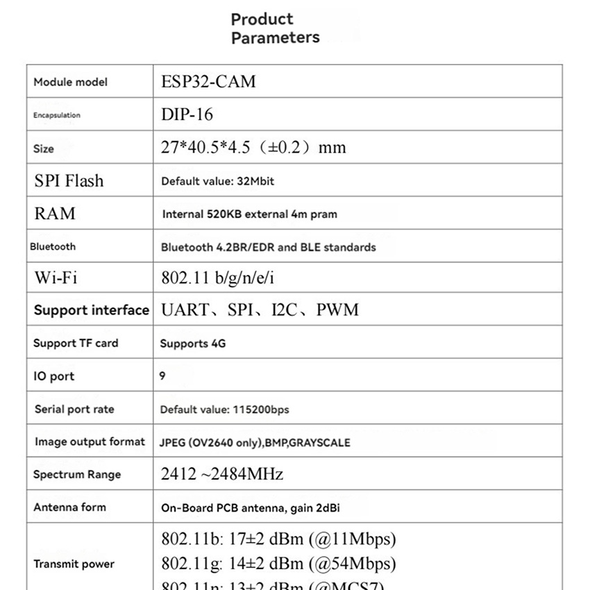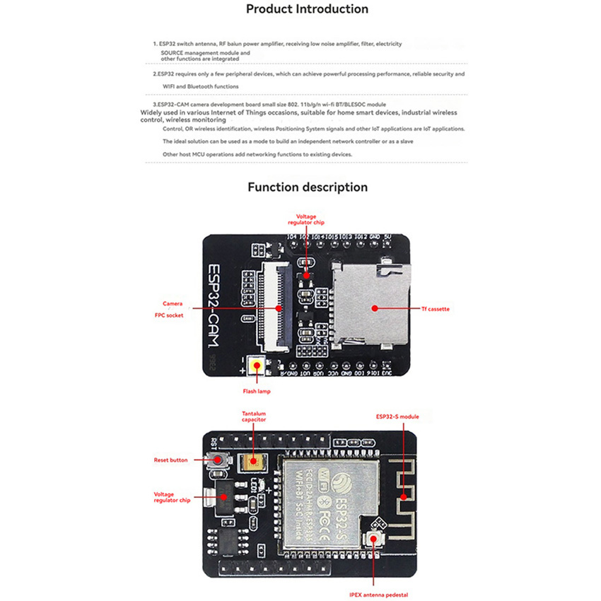 l ESP32-CAM camera development board compact 802.11b/g/n Wi-Fi + BT/BLE SOC module can be widely used in a variety of IoT occasions, suitable for home smart devices, industrial wireless control, wireless monitoring, or wireless identification, wireless positioning system signals, and other IoT applications, it is the ideal solution for IoT applications, can be used as a mode of It is an ideal solution for IOT applications, and can be used as a mode to build an independent network controller, or as a slave to be mounted on other host microprocessors to increase the networking function for existing devices