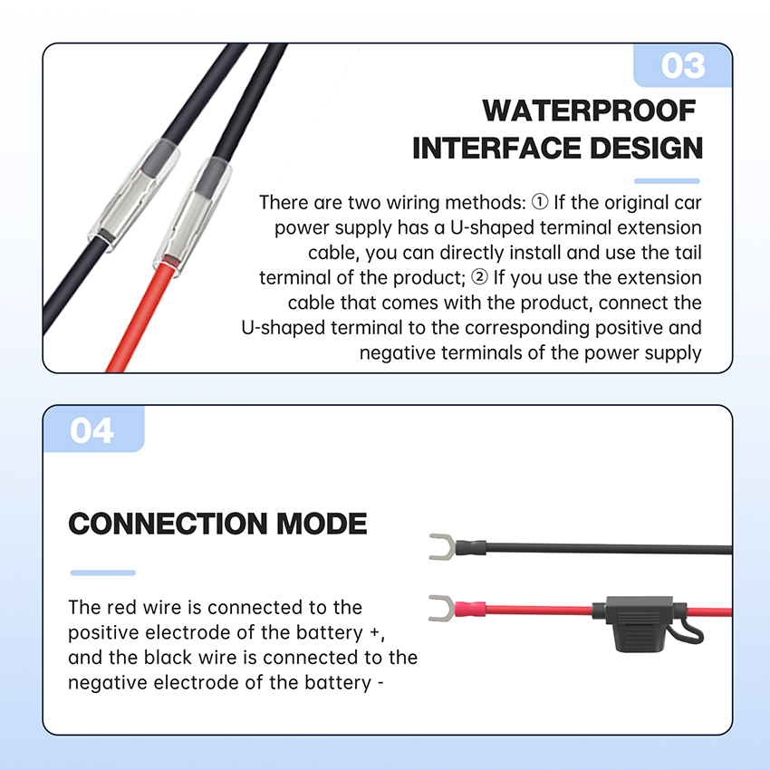 l Two Wiring Methods Are Safe and Simple, the waterproof sleeve at the end of the wire ring terminal directly to the power supply positive and negative or through the ring terminal docking extended U-shaped terminals to the power supply positive and negative