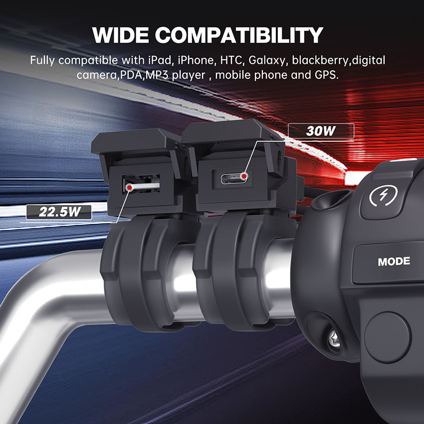 l Dual Fast Charge Motorcycle A+C Charger - The upgraded motorcycle cell phone charger is equipped with 30W USB - C (PD powered) and 18W USB - A dual ports. You can charge two devices at the same time
