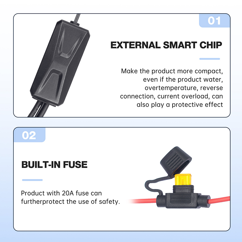 l One-Piece Protective Cover - The motorcycle USB charger has a unique protective cover design that is more attractive and compact. It can more effectively prevent water and dust from entering the port and protect the internal circuitry, thus prolonging the service life